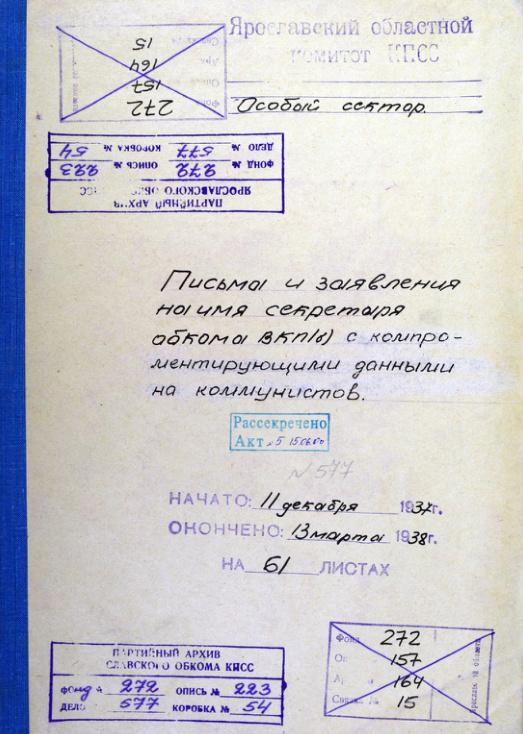 Письма и заявления на имя секретаря Ярославского обкома ВКП(б) с компрометирующими данными на коммунистов. 13 марта 1938 г.