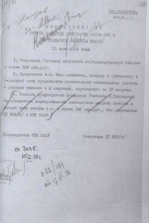 Постановление Политбюро ЦК ВКП(б) п. 62/199 "О Госбанке". 17 июля 1938 г.