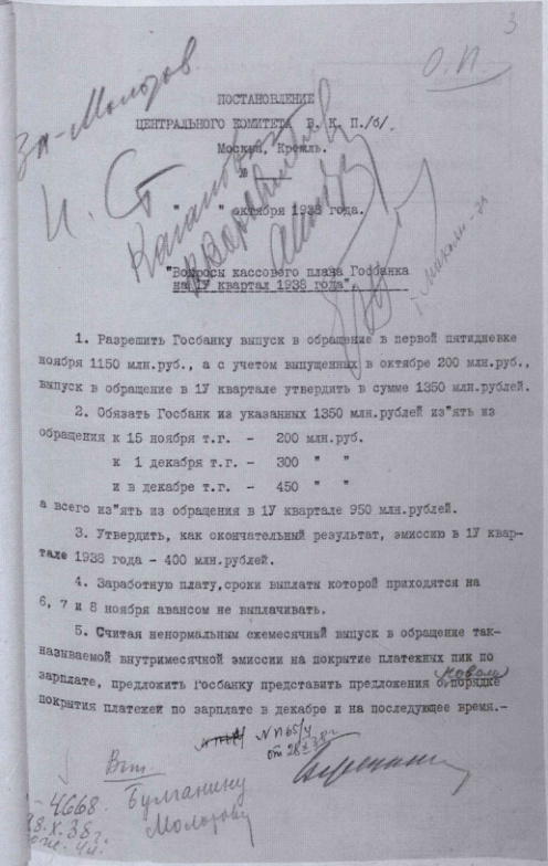 Постановление Политбюро ЦК ВКП(б) п. 65/4 "Вопросы кассового плана Госбанка на IV квартал 1938 г.". 28 октября 1938 г.