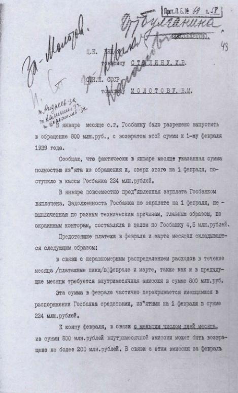 Постановление Политбюро ЦК ВКП(б) п. 68/58 "Вопрос Госбанка". 9 февраля 1939 г.