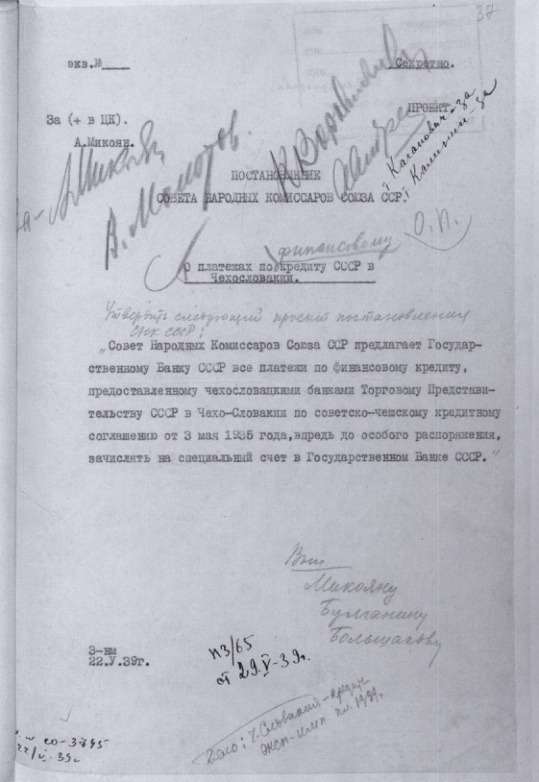 Постановление Политбюро ЦК ВКП(б) п. 3/65 "О платежах по финансовому кредиту СССР в Чехословакии". 29 мая 1939 г.