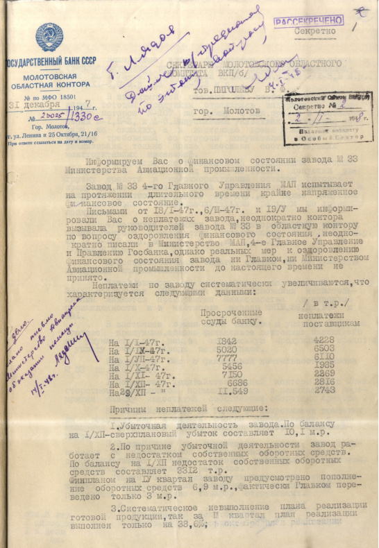 Записка М. Коткова о финансовом состоянии завода №33 МАП. 31 декабря 1947 г.