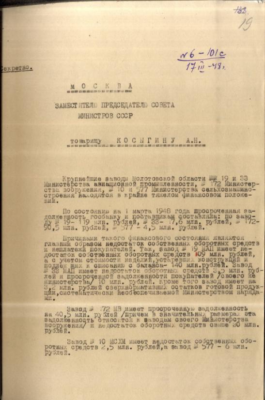 Записка Пигалева П.Ф. о тяжелом финансовом положении заводов №19 и 33 МАП. 17 марта 1948 г.