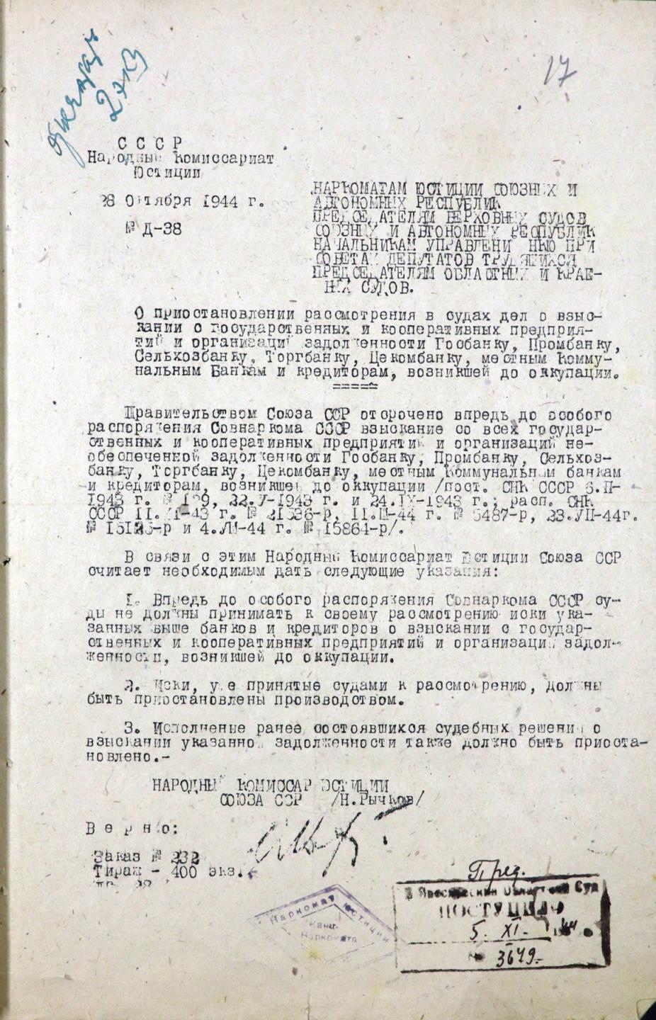 - Циркуляр Народного Комиссариата Юстиции СССР № Д-38 О приостановлении рассмотрения в судах дел о взыскании с государственных и кооперативных предприятий и организаций задолженности Госбанку ... и кредиторам, возникшей до оккупации. 28 октября 1944 г.