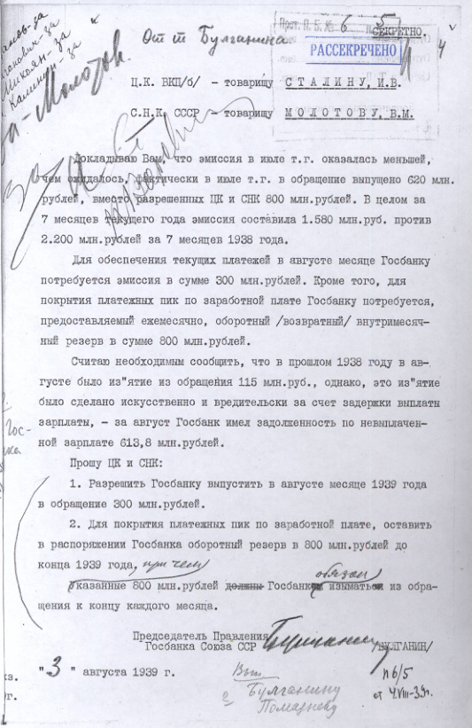 Постановление Политбюро ЦК ВКП(б) п. 6/5 "Вопрос Госбанка" с приложением записки Н.А. Булганина. 4 августа 1939 г.