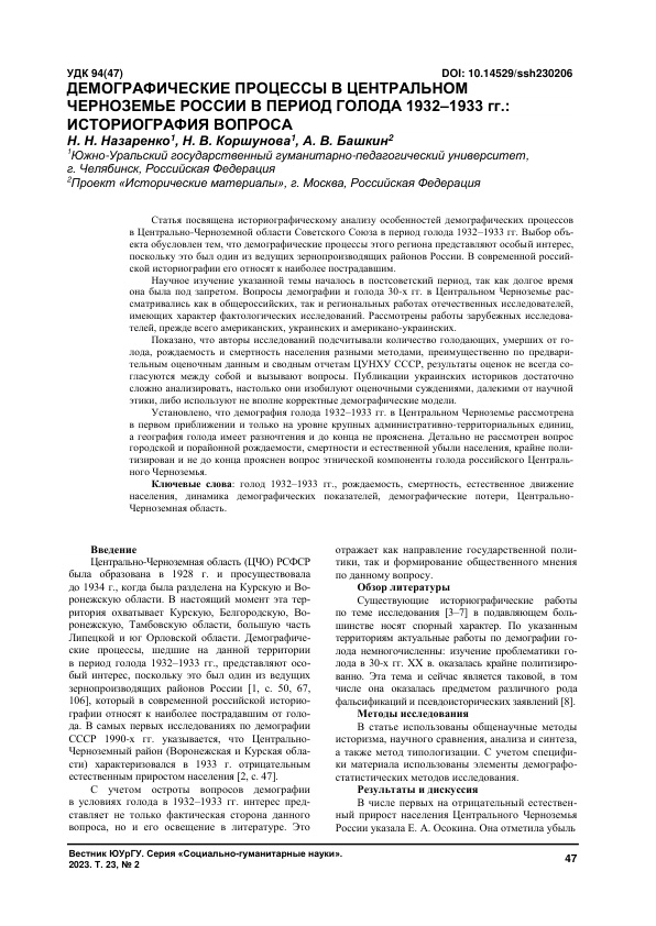 Демографические процессы в Центральном Черноземье России в период голода 1932–1933 гг.: историография вопроса