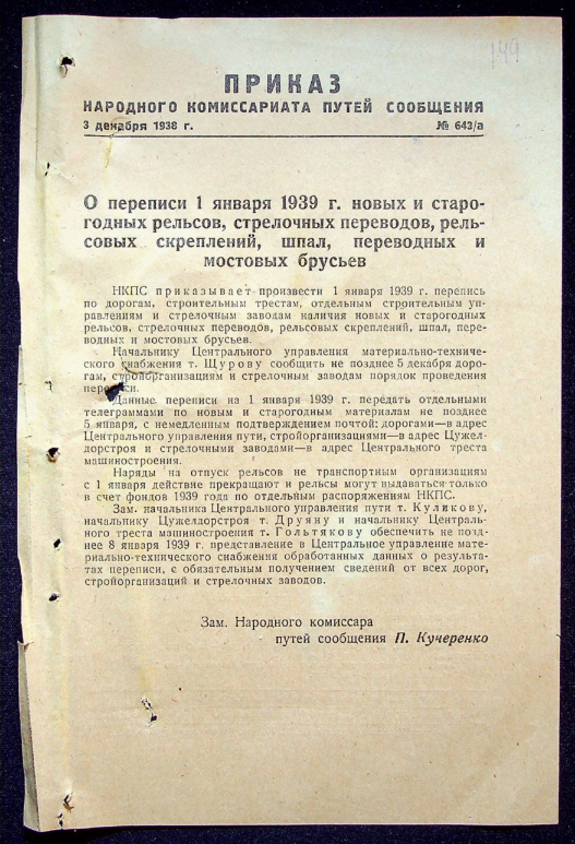 Приказ Народного Комиссара Путей Сообщения № 643/а. О переписи 1 января 1939 г. новых и старогодных рельсов, стрелочных переводов, рельсовых скреплений, шпал, переводных и мостовых брусьев. 3 декабря 1938 г.