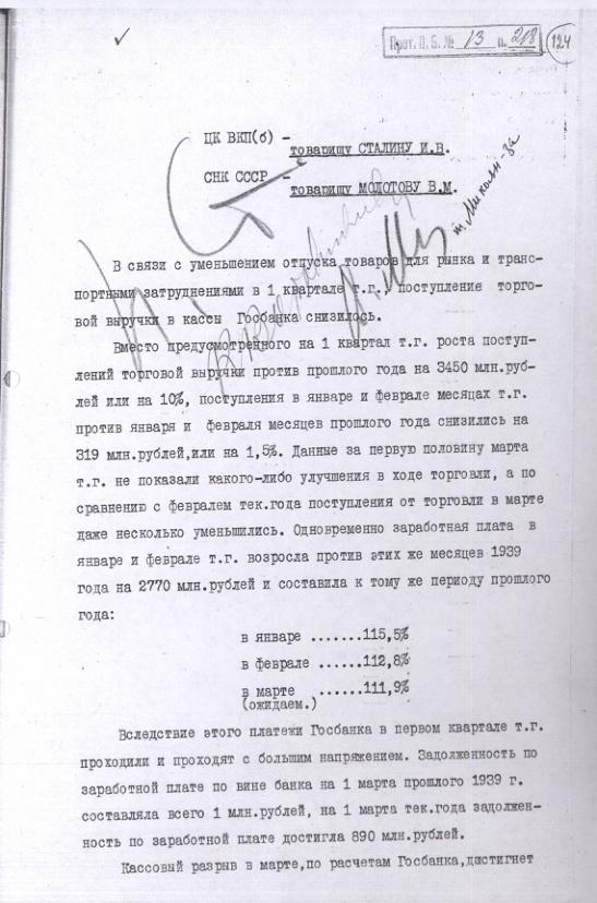 Постановление Политбюро ЦК ВКП(б) п. 13/218 "Вопрос Госбанка" с приложением записки Н.А. Булганина. 17 марта 1940 г.