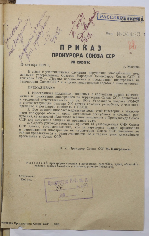 Приказ Прокурора Союза ССР № 202/97с. О порядке привлечения к уголовной ответственности иностранных подданных, виновных в нарушении правил передвижения и проживания на территории Союза ССР. 19 октября 1939 г.