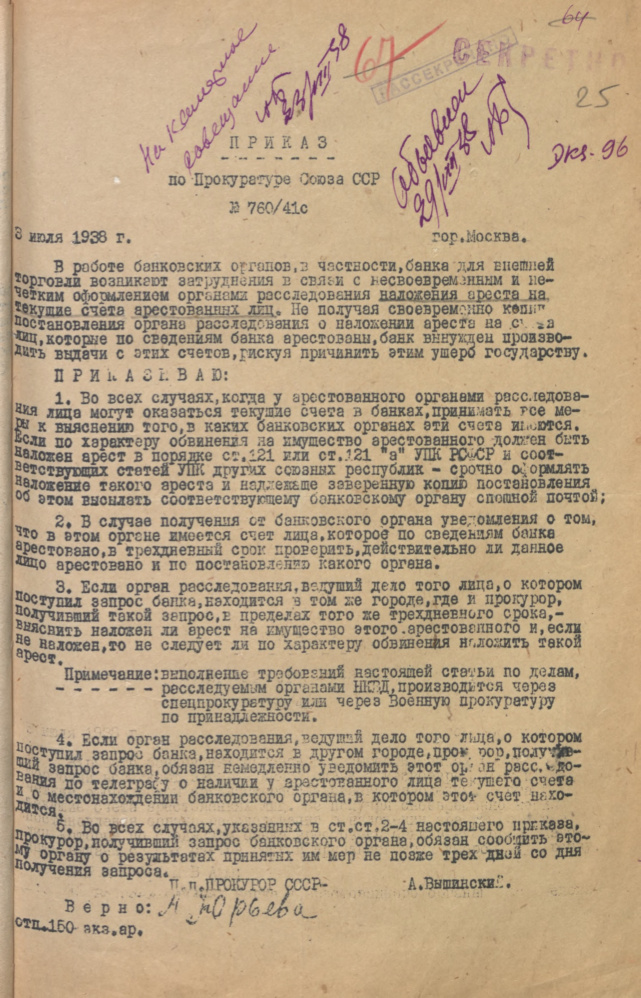 Приказ по Прокуратуре Союза ССР № 760/41с. О порядке наложения ареста на банковские счета арестованных лиц. 3 июля 1938 г.