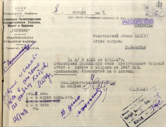 Годовой отчет о работе с кадрами на Краснокамской бумажной фабрике "ГОЗНАК". 1 января 1948 г.