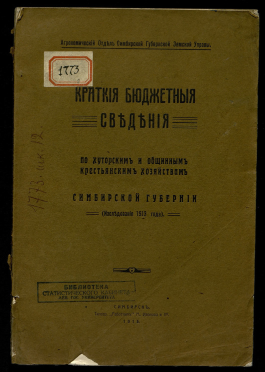 Краткие бюджетные сведения по хуторским и общинным крестьянским хозяйствам Симбирской губ. 1913