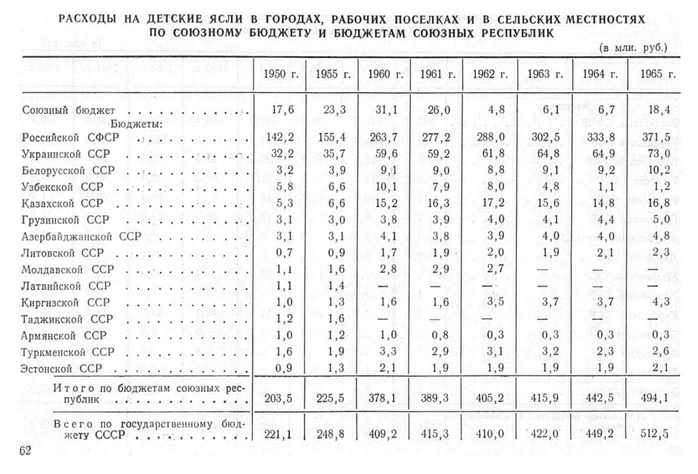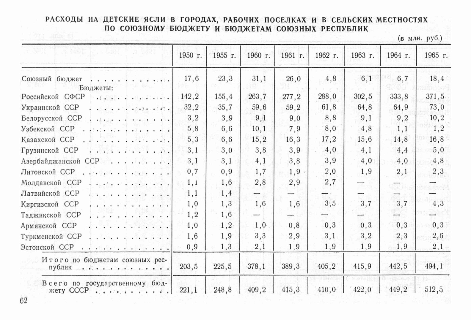 Содержит сведения о расходах союзного бюджета и бюджетов союзных республик СССР на детские ясли в городах, рабочих поселках и в сельских местностях в периоды 1950, 1955, 1960-1965 в миллионах рублей.