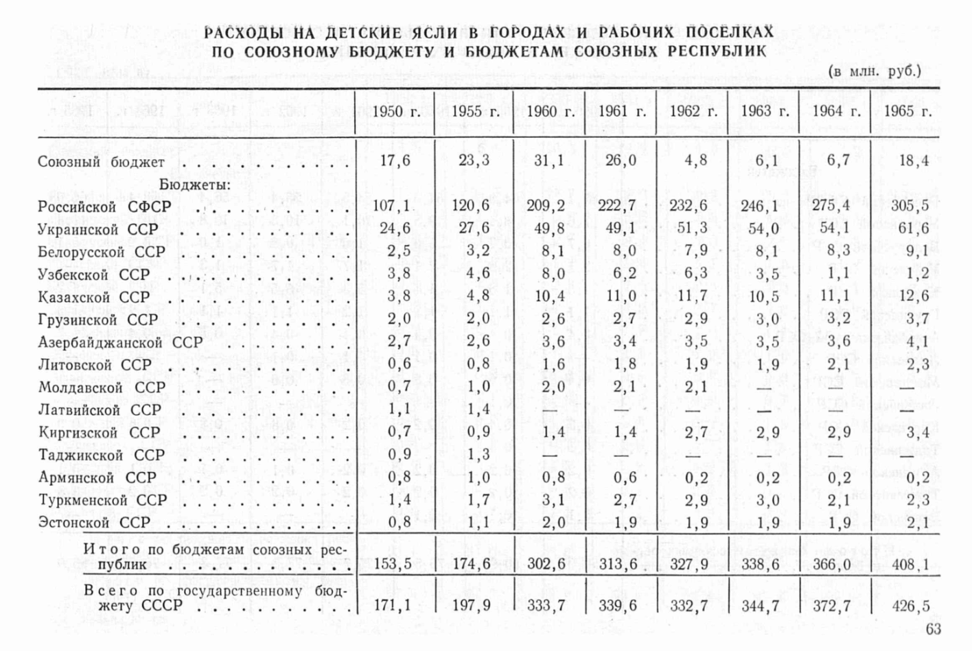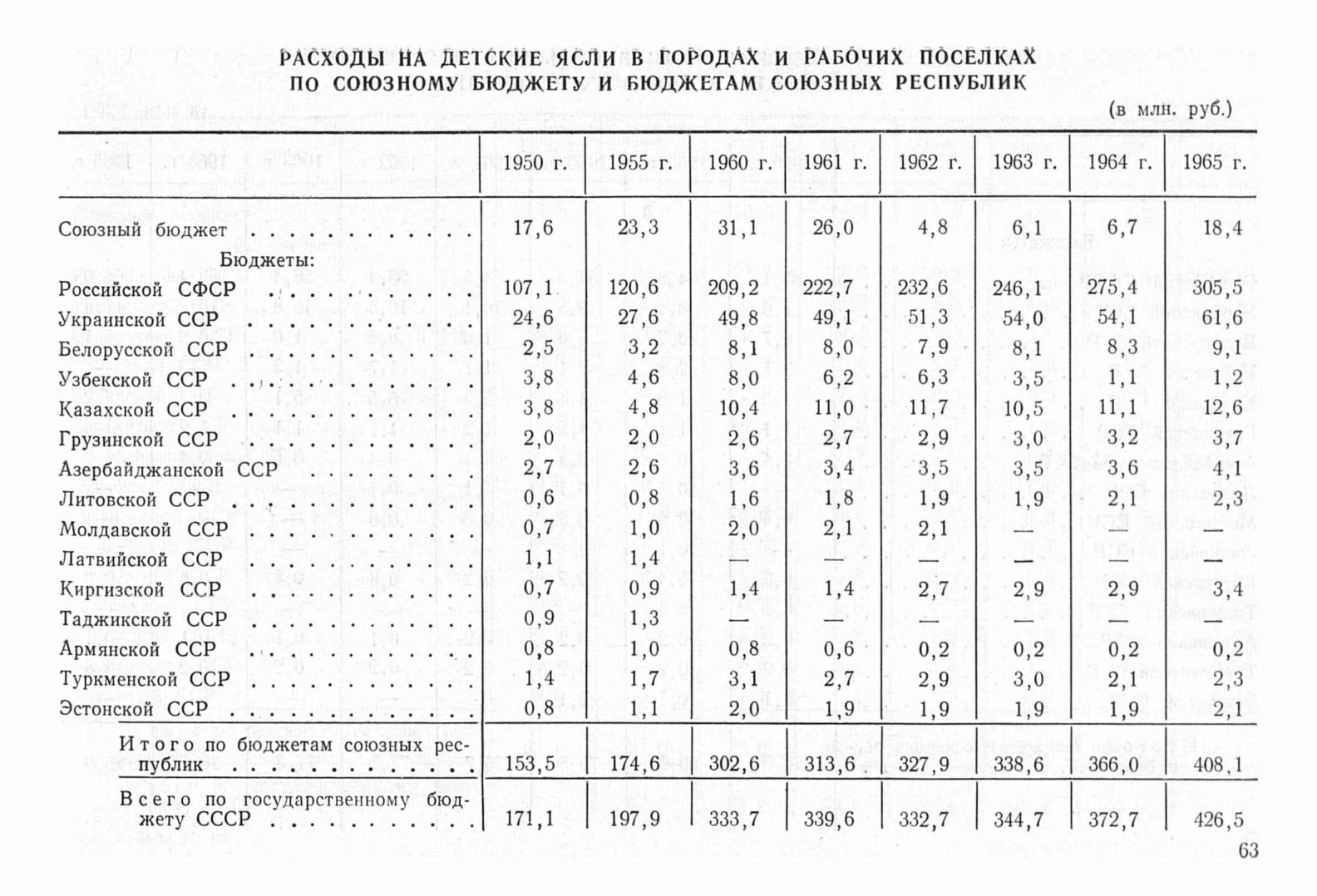Содержит сведения о расходах союзного бюджета и бюджетов союзных республик СССР на детские ясли в городах и рабочих поселках в периоды 1950, 1955, 1960-1965 в миллионах рублей.