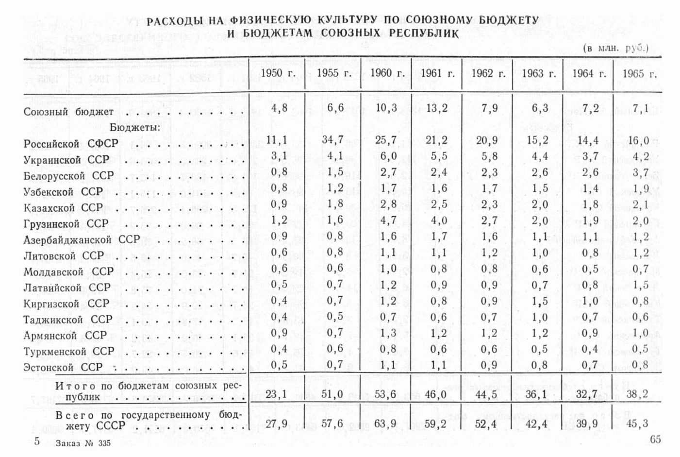 Содержит сведения о расходах союзного бюджета и бюджетов союзных республик СССР на физическую культуру в периоды 1950, 1955, 1960-1965 в миллионах рублей.