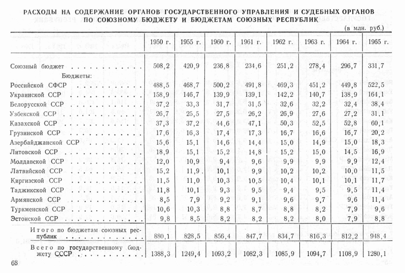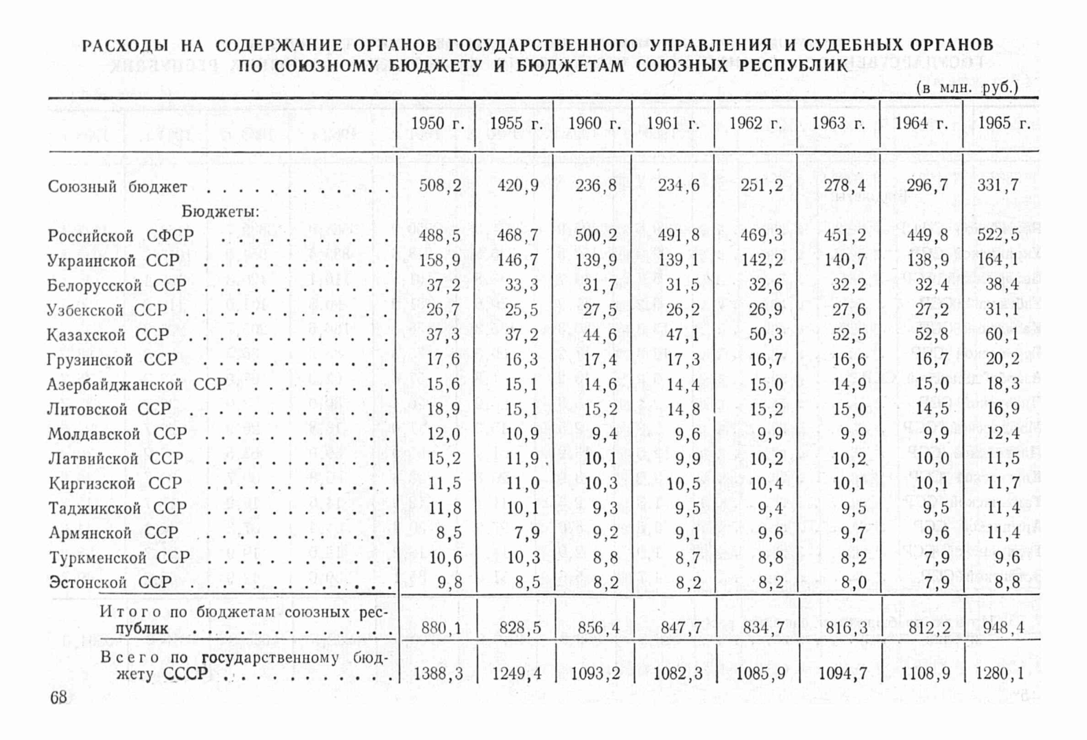 Содержит сведения о расходах союзного бюджета и бюджетов союзных республик СССР на содержание органов государственного управления и судебных органов в периоды 1950, 1955, 1960-1965 в миллионах рублей.