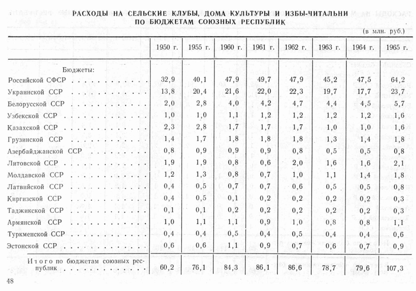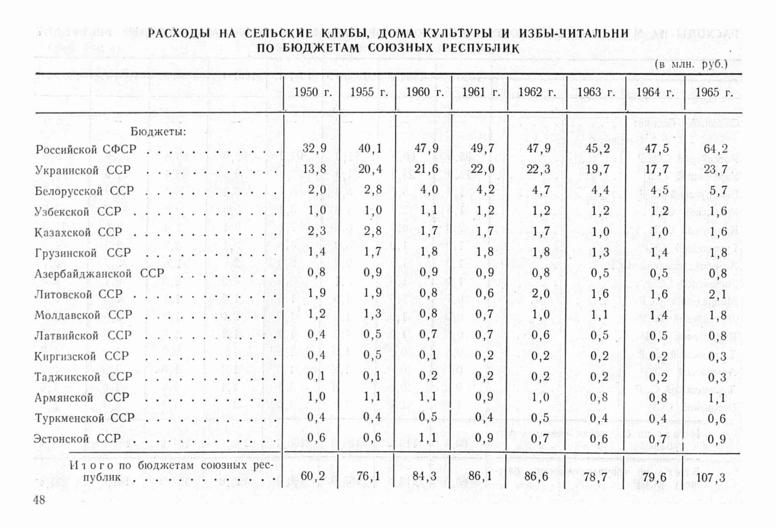 Содержит сведения о расходах бюджетов союзных республик СССР на сельские клубы, дома культуры и избы-читальни в периоды 1950, 1955, 1960-1965 в миллионах рублей.