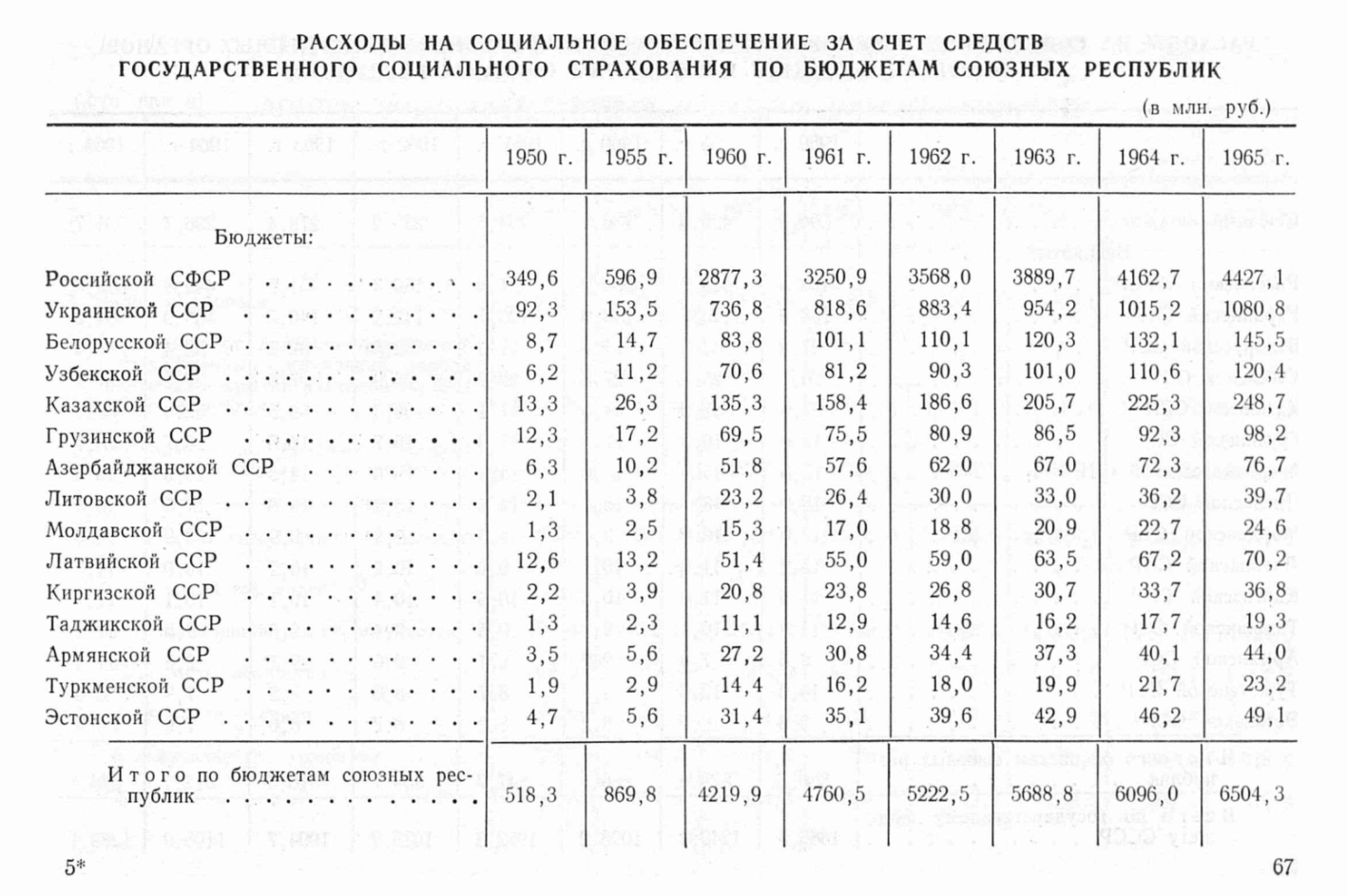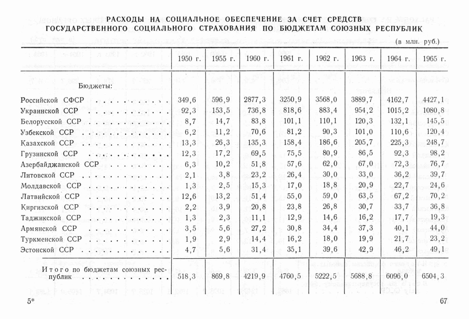 Содержит сведения о расходах бюджетов союзных республик СССР на социальное обеспечение за счет средств государственного социального страхования в периоды 1950, 1955, 1960-1965 в миллионах рублей.