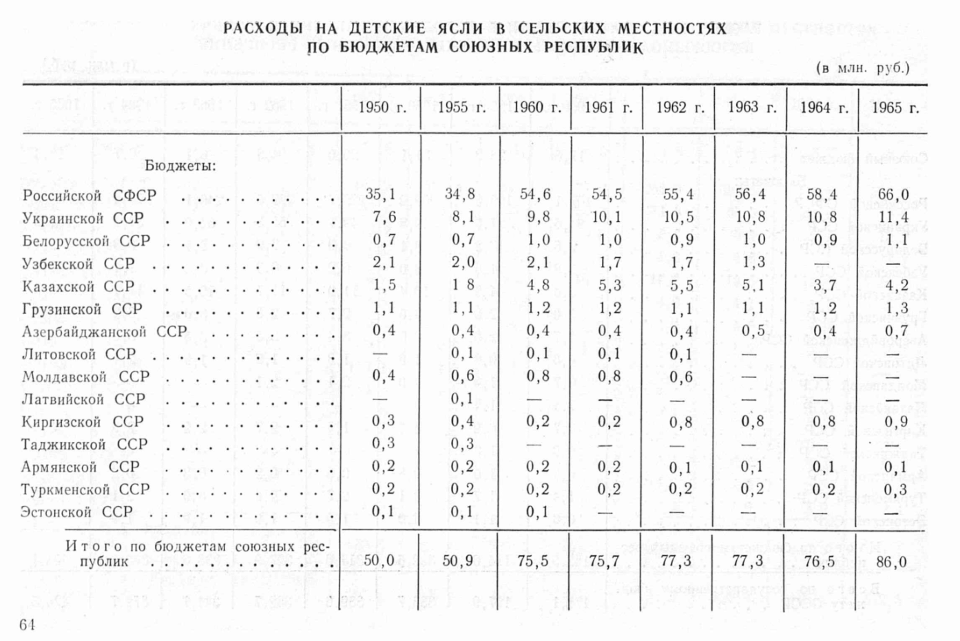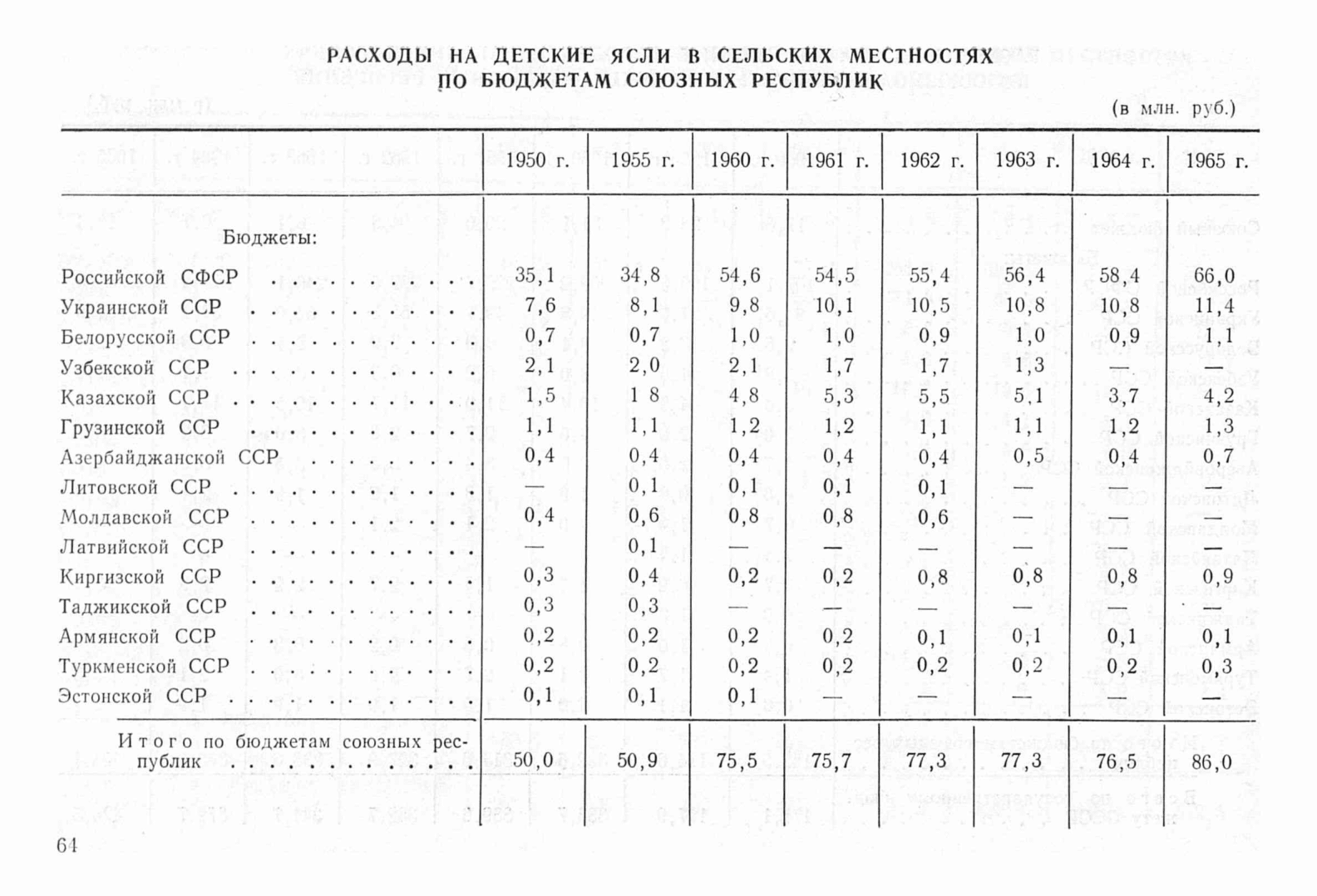 Содержит сведения о расходах бюджетов союзных республик СССР на детские ясли в сельских местностях в периоды 1950, 1955, 1960-1965 в миллионах рублей.