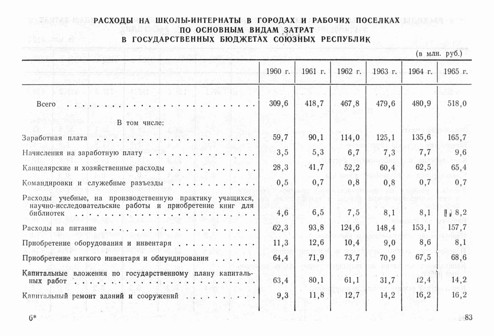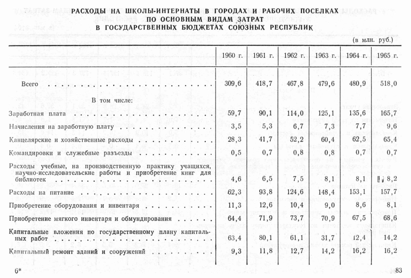 Содержит сведения о расходах на школы-интернаты в городах и рабочих поселках по основным видам затрат в государственных бюджетах союзных республик в период 1960-1965 в миллионах рублей.