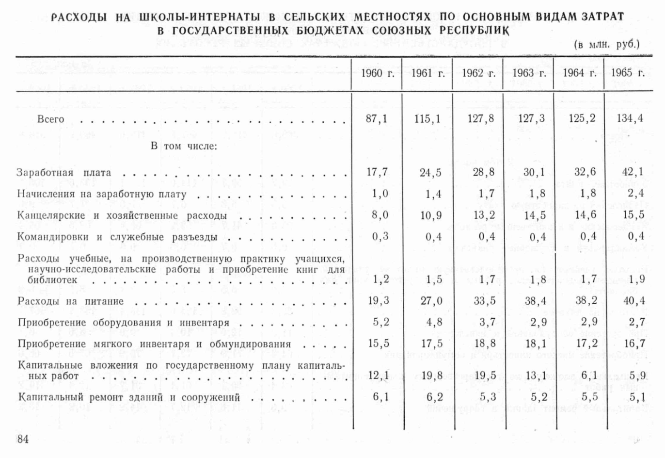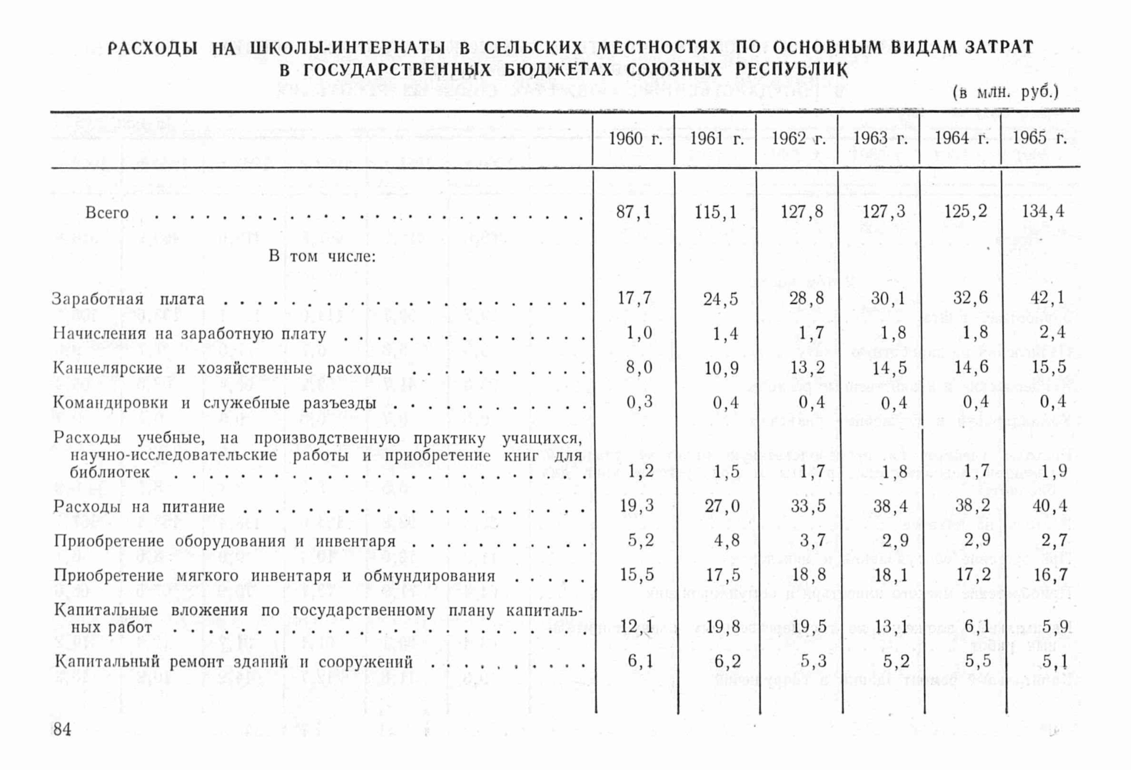 Содержит сведения о расходах нашколы-интернаты в сельских местностях по основным видам затрат в государственных бюджетах союзных республик в период 1960-1965 в миллионах рублей.