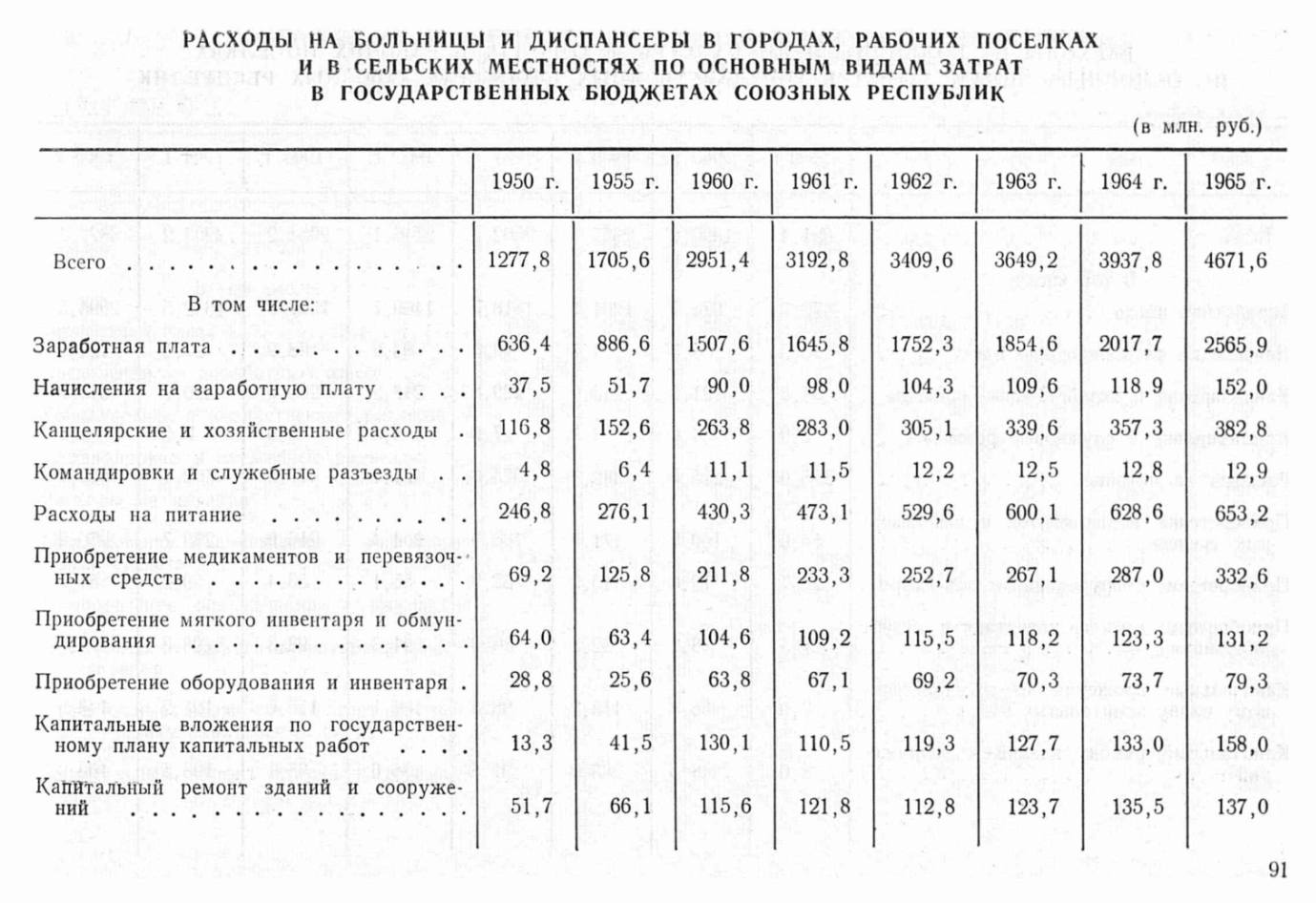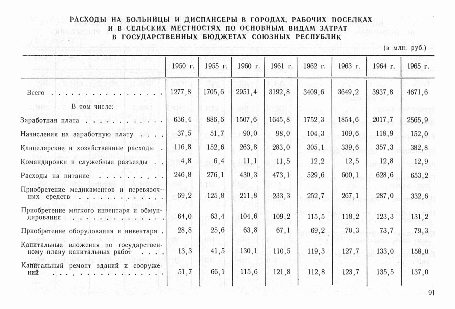 Содержит сведения о расходах на больницы и диспансеры в городах, рабочих поселках и в сельских местностях по основным видам затрат в государственных бюджетах союзных республик в периоды 1950, 1955, 1960-1965 в миллионах рублей.