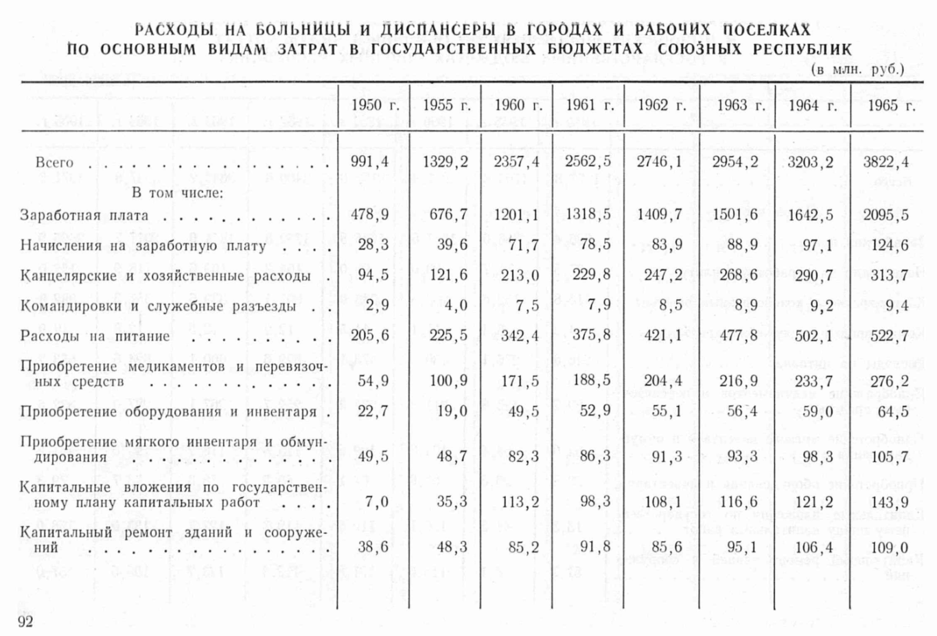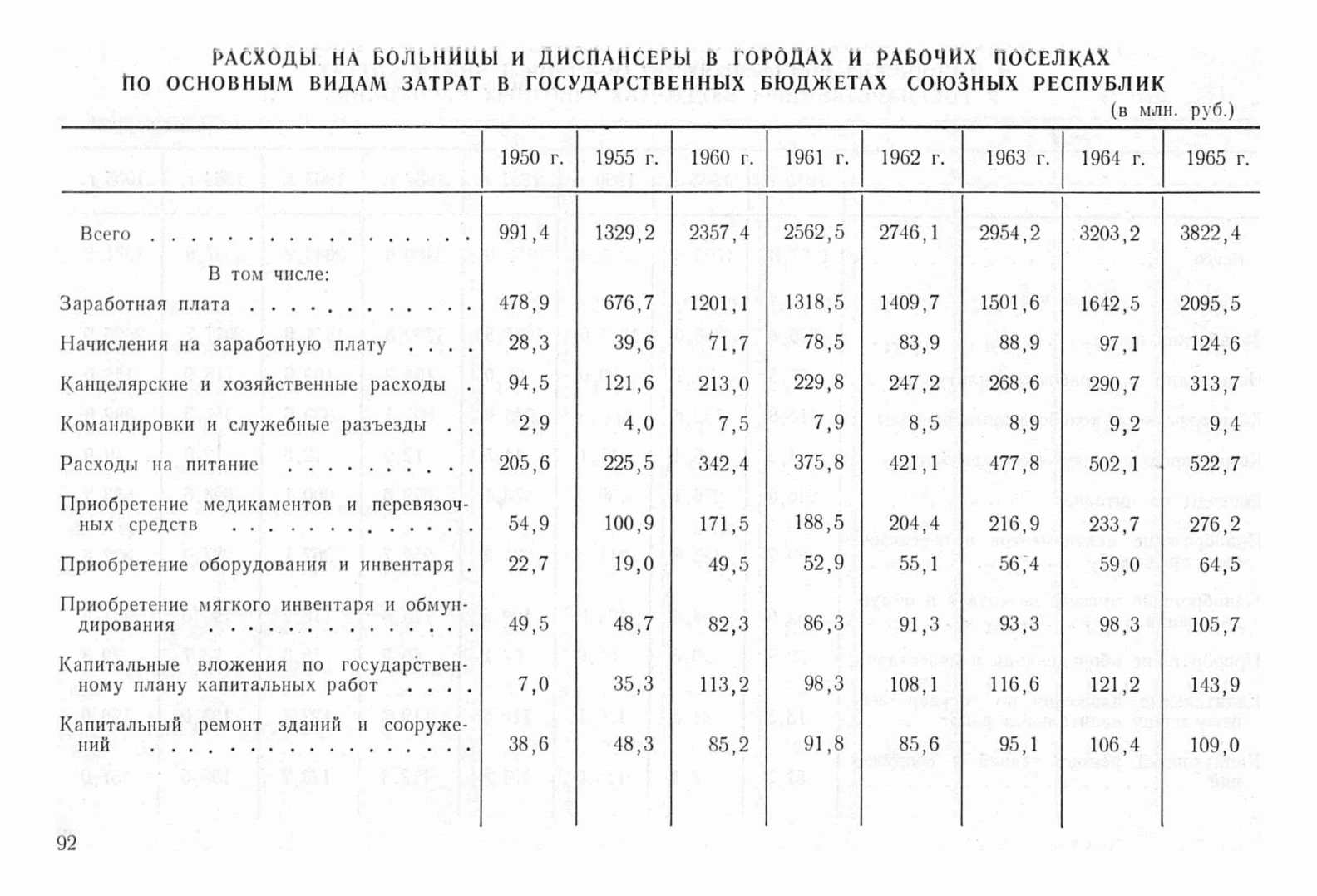 Содержит сведения о расходах на больницы и диспансеры в городах и рабочих поселках по основным видам затрат в государственных бюджетах союзных республик в периоды 1950, 1955, 1960-1965 в миллионах рублей.