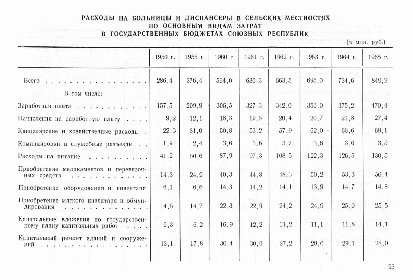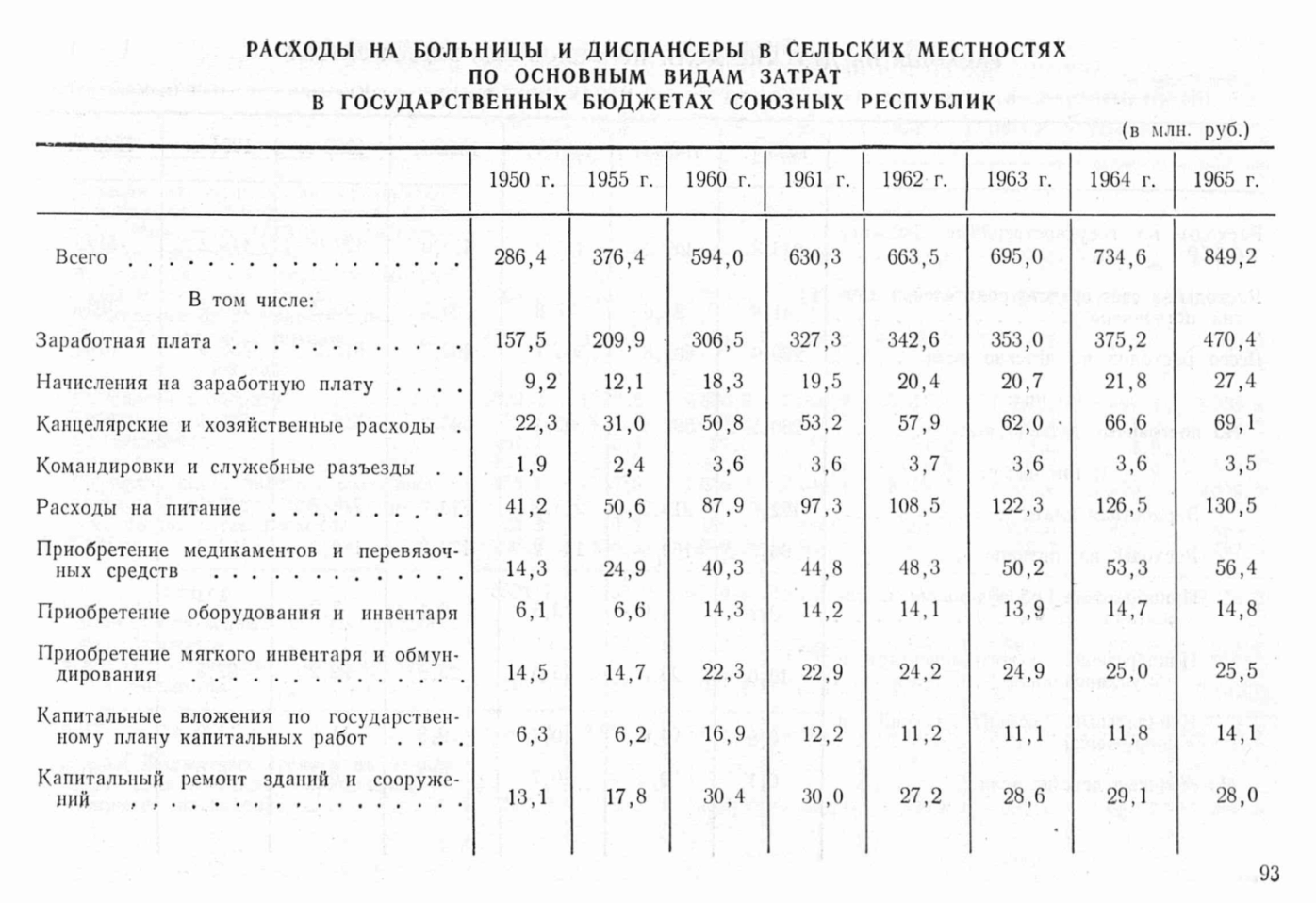 Содержит сведения о расходах на больницы и диспансеры в сельских местностях по основным видам затрат в государственных бюджетах союзных республик в периоды 1950, 1955, 1960-1965 в миллионах рублей.
