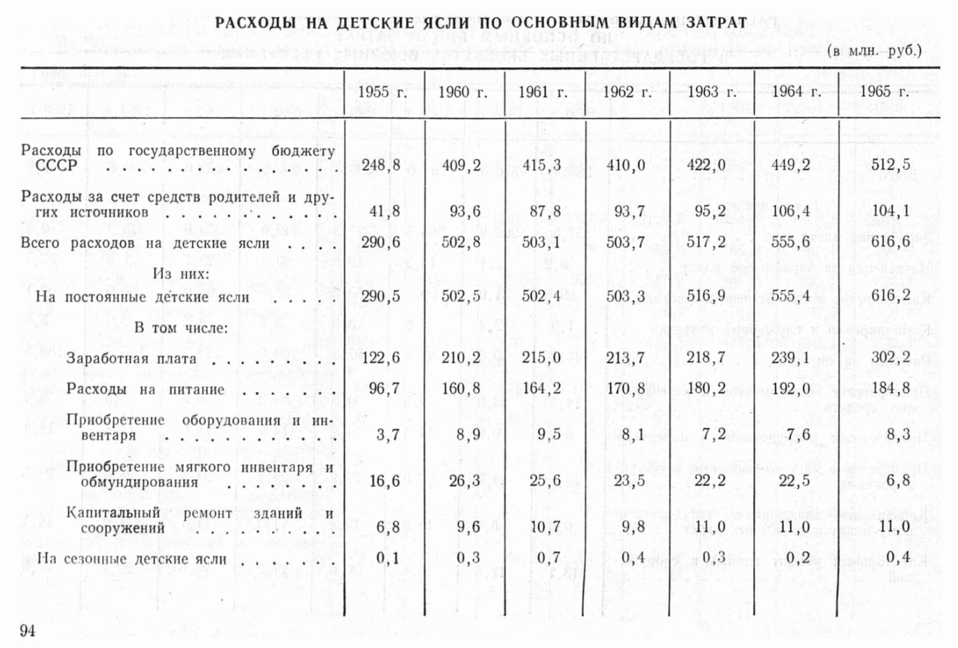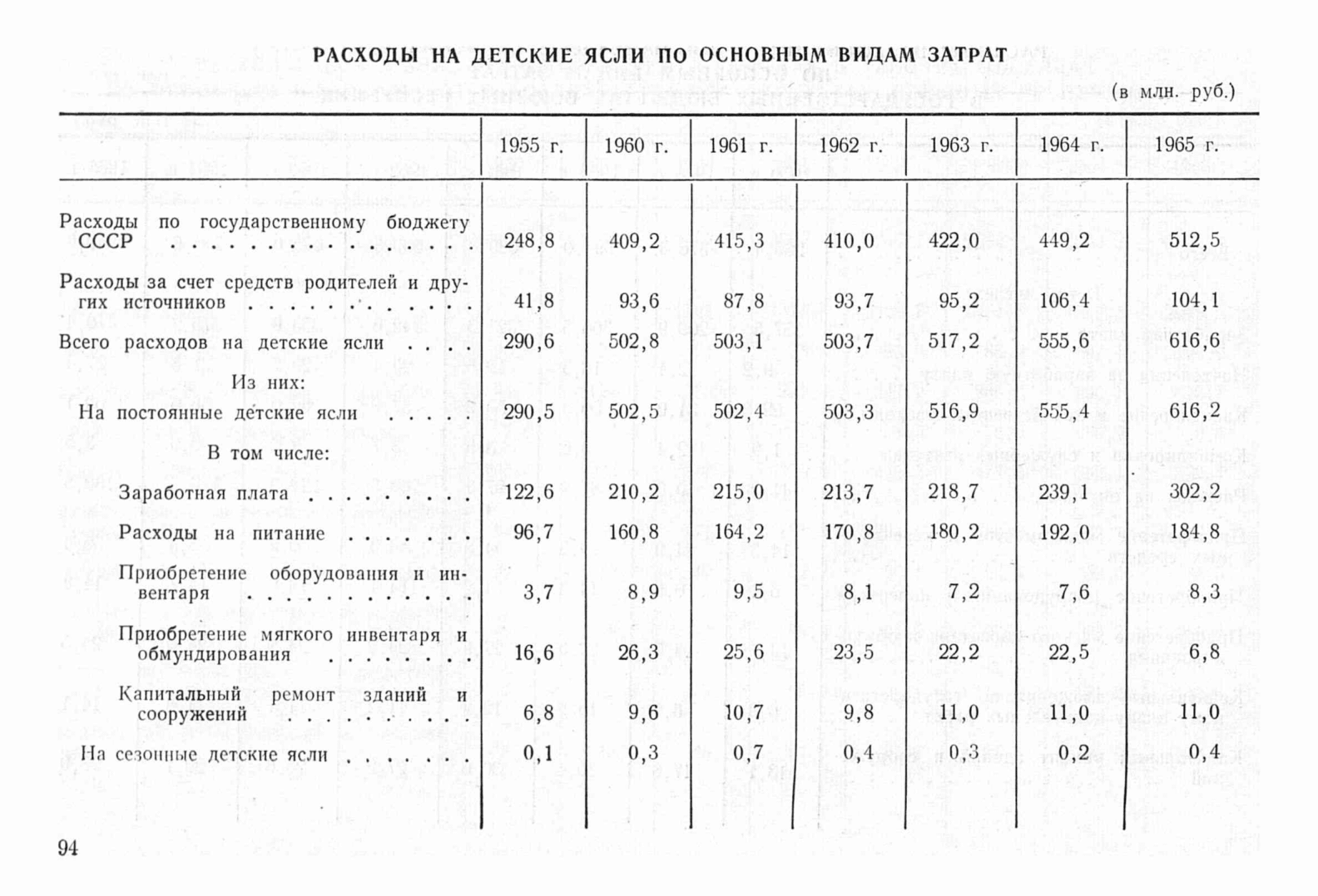 Содержит сведения о расходах на детские ясли по основным видам затрат в периоды 1955, 1960-1965 в миллионах рублей.