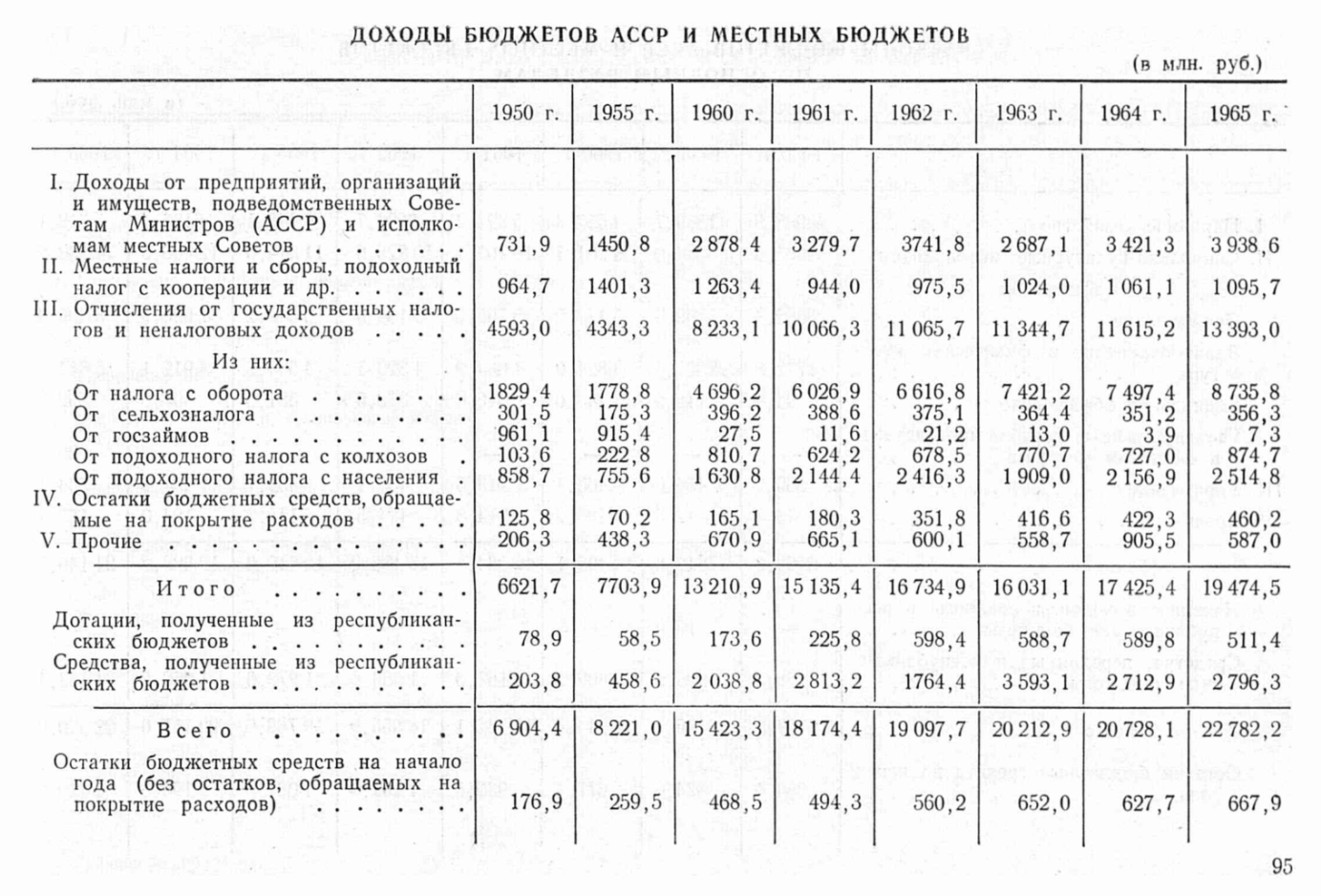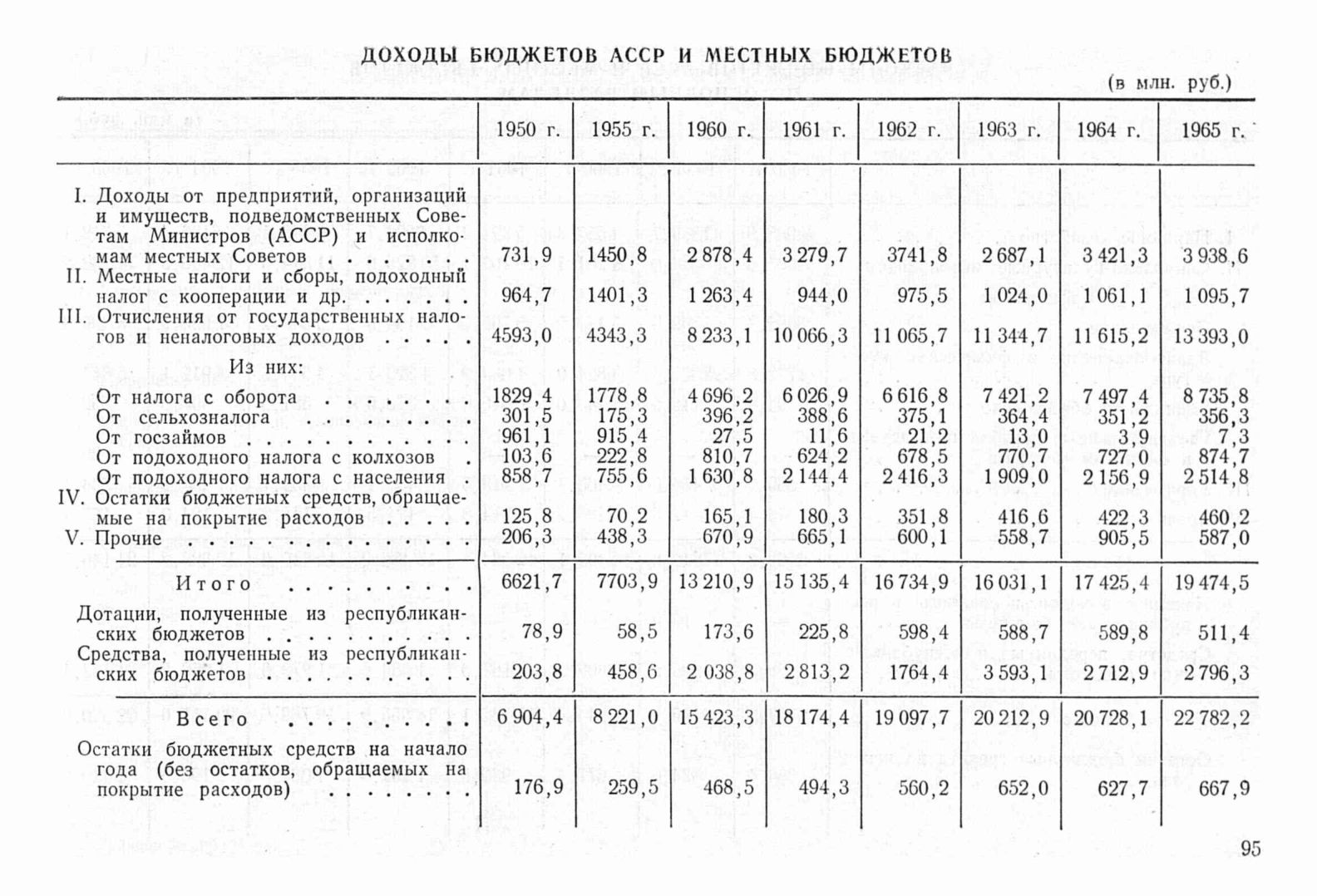 Содержит сведения о доходах бюджетов АССР и местных бюджетов в периоды 1950, 1955, 1960-1965 в миллионах рублей.