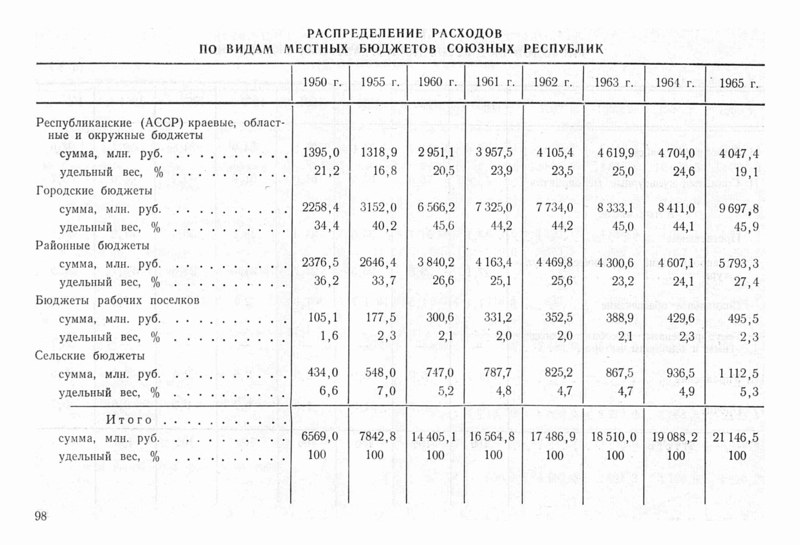 Содержит сведения о распределении расходов по видам местных бюджетов союзных республик в периоды 1950, 1955, 1960-1965 в миллионах рублей и в процентах от общей суммы расходов.