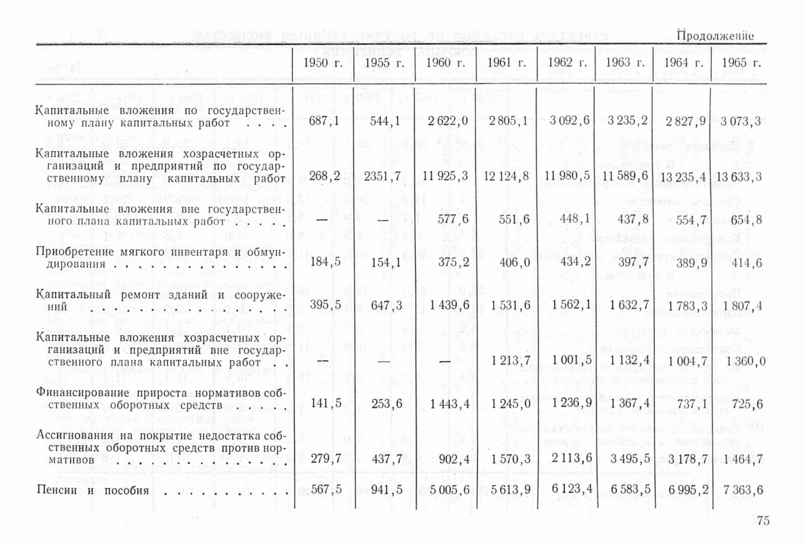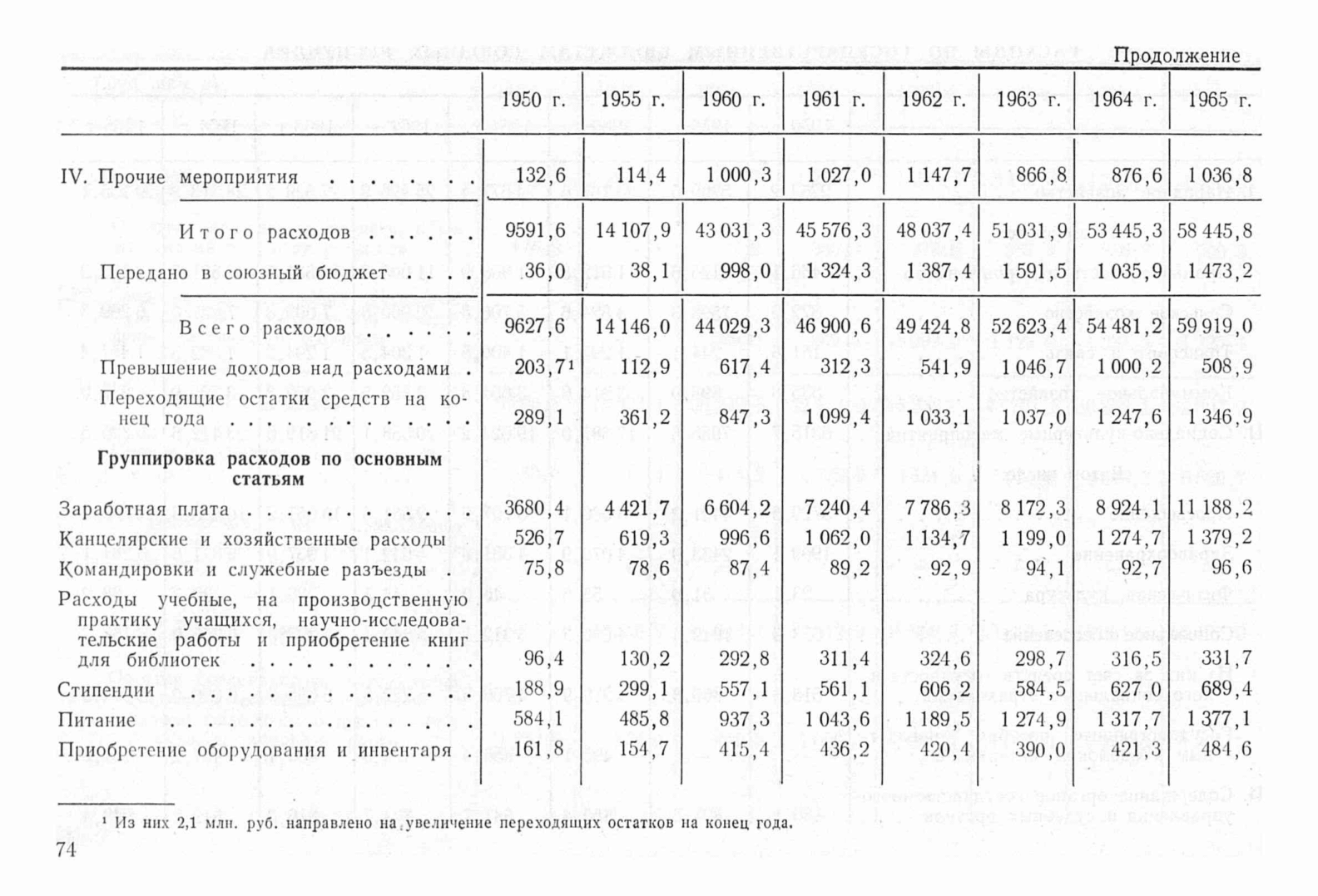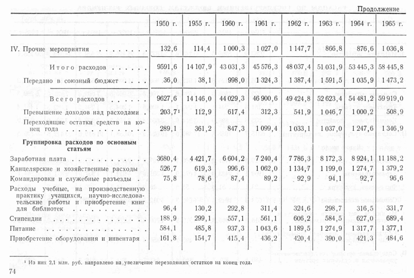 Содержит сгруппированные по основным статьям расходы по государственным бюджетам союзных республик в периоды 1950, 1955, 1960-1965 в миллионах рублей.