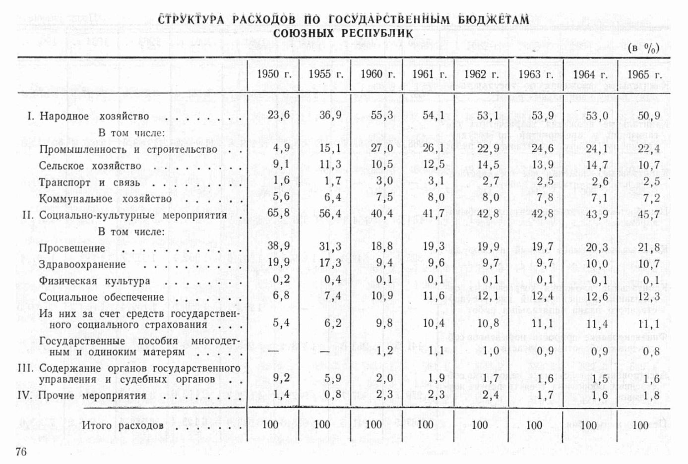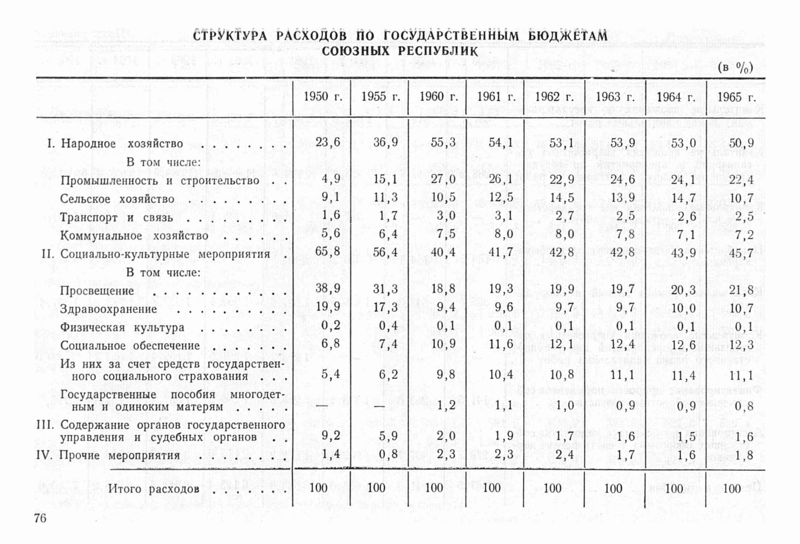 Содержит структуру расходов по государственным бюджетам союзных республик в периоды 1950, 1955, 1960-1965 в процентах.