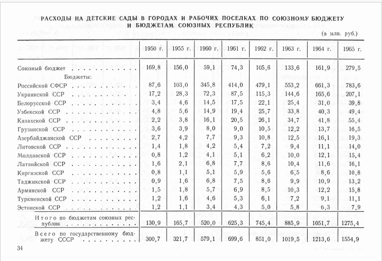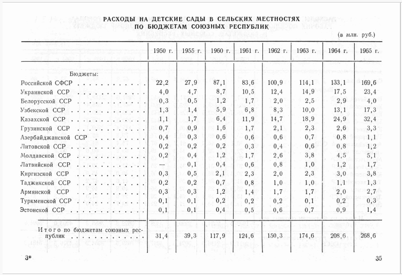 Содержит сведения о расходах на детские сады в городах, рабочих поселках и сельских местностях по бюджетам союзных республик СССР в периоды 1950, 1955, 1960-1965 гг. в миллионах рублей.