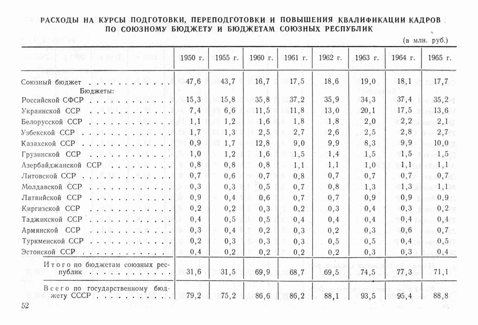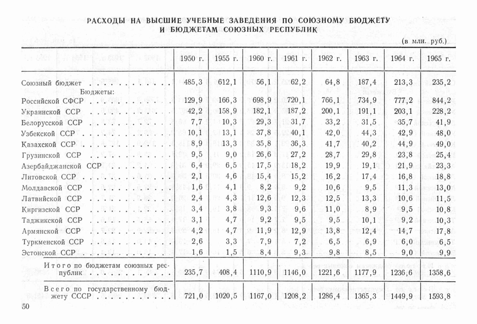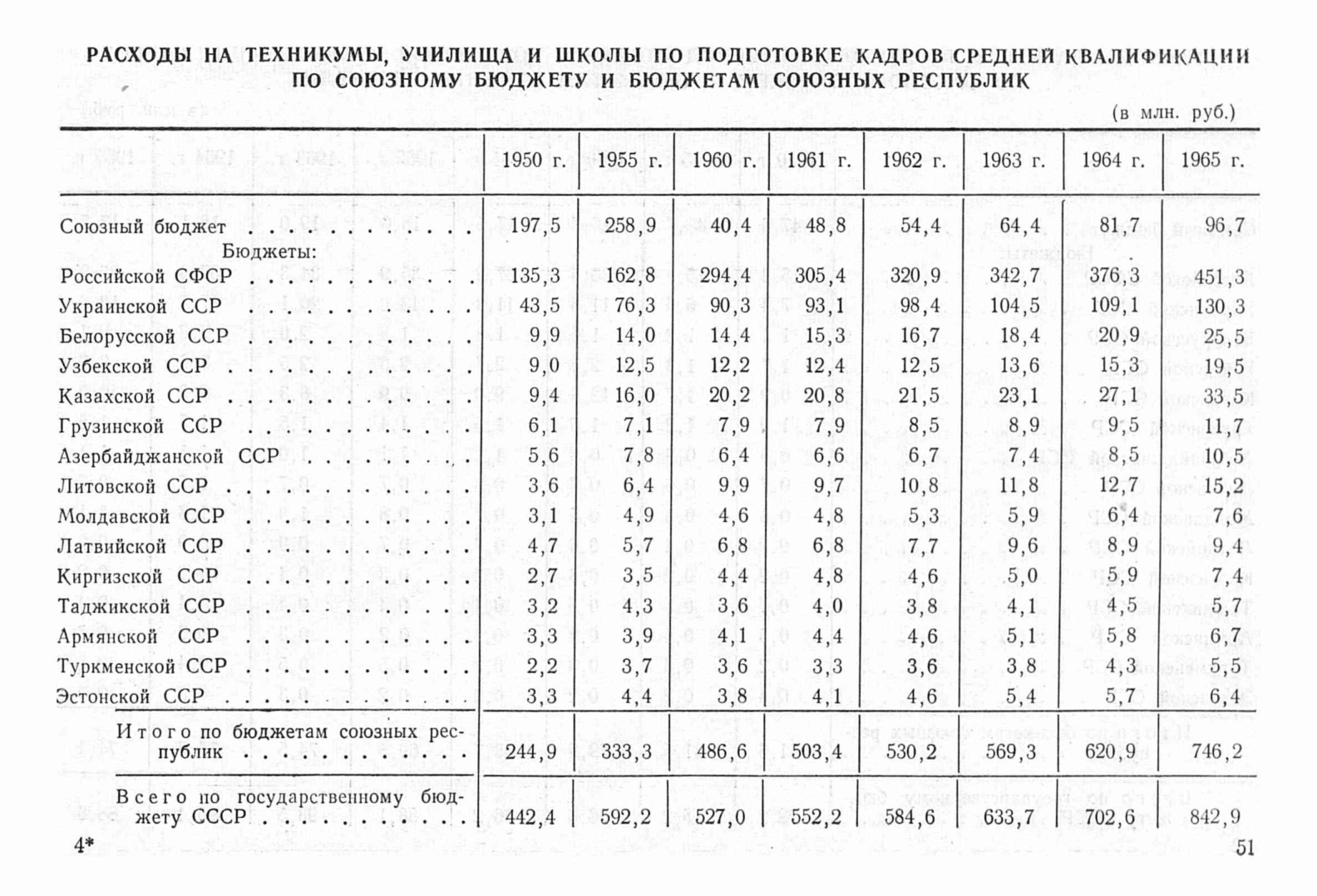 Содержит сведения о расходах союзного бюджета и бюджетов союзных республик СССР на ВУЗы, техникумы, училища и школы по подготовке кадров средней квалификации, а также на курсы подготовки, переподготовки и повышения квалификации кадров в периоды 1950, 1955, 1960-1965 в миллионах рублей.