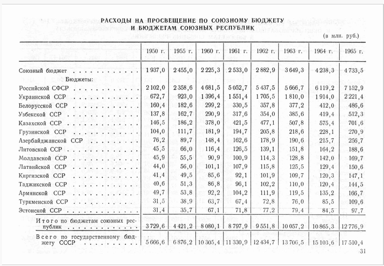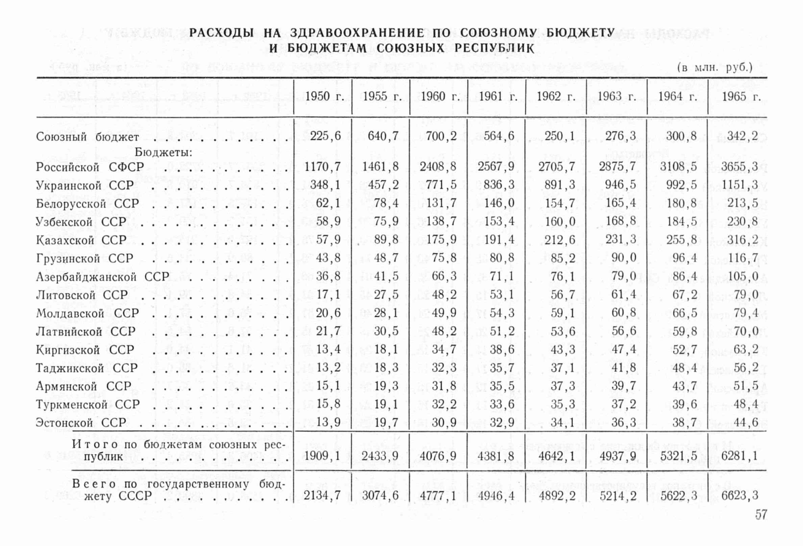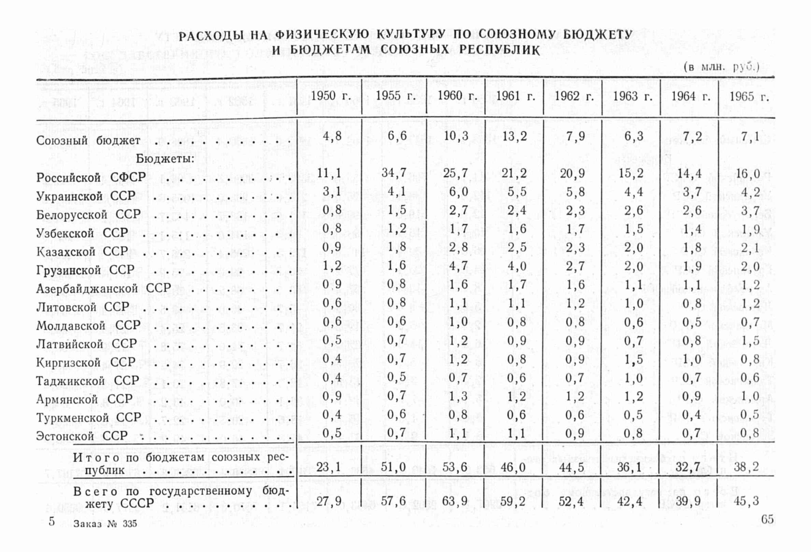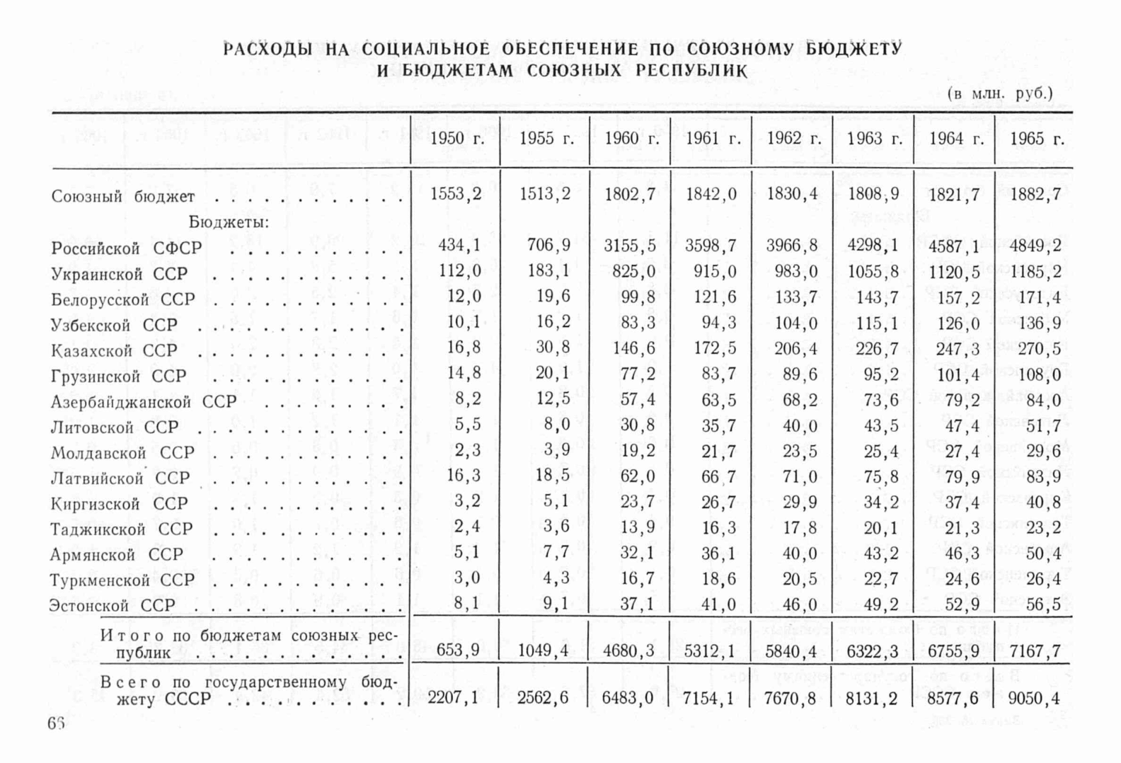 Содержит сведения о расходах на просвещение, здравоохранение, физическую культуру и социальное обеспечение по союзному бюджету и бюджетам союзных республик СССР в периоды 1950, 1955, 1960-1965 гг. в миллионах рублей.