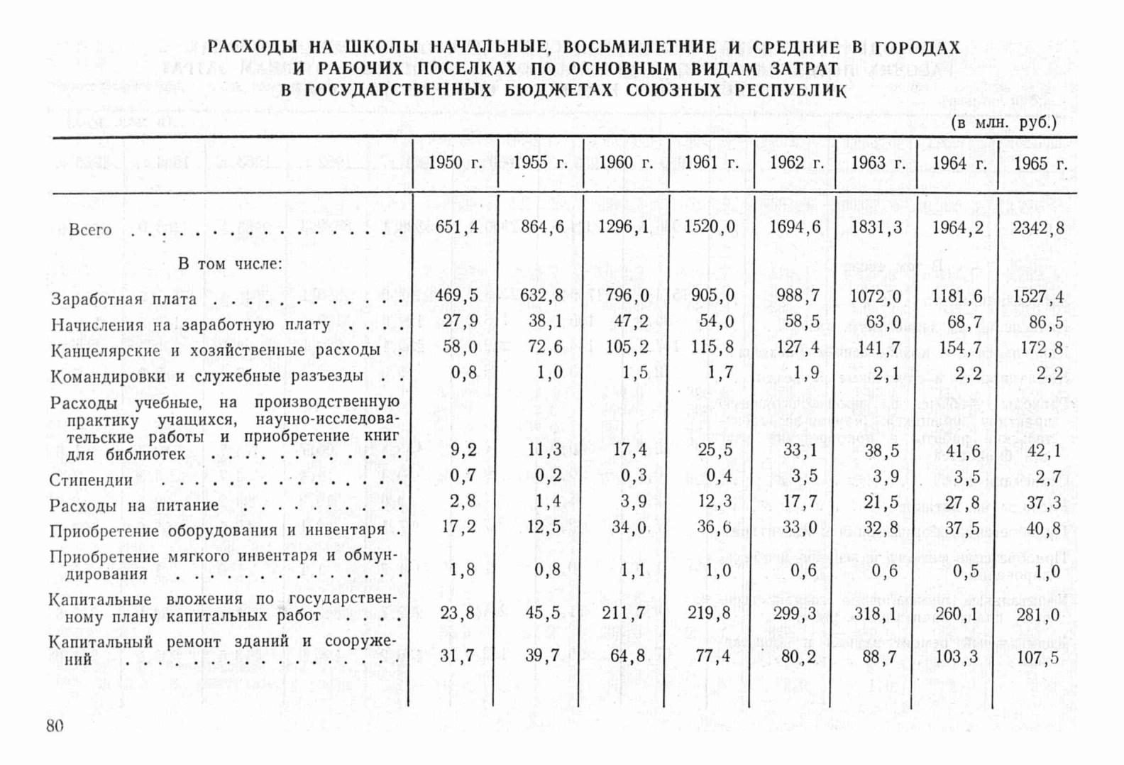 Содержит сведения о расходах на начальные, восьмилетние и средние школы в городах, рабочих поселках и сельских местностях по основным видам затрат в государственных бюджетах союзных республик в периоды 1950, 1955, 1960-1965 в миллионах рублей.