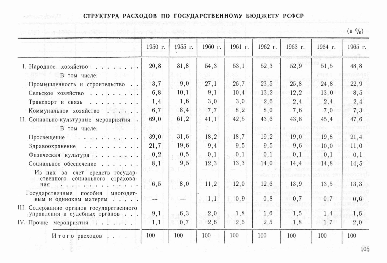 Содержит сведения о расходах по государственному бюджету РСФСР в периоды 1950, 1955, 1960-1965 в миллионах рублей.