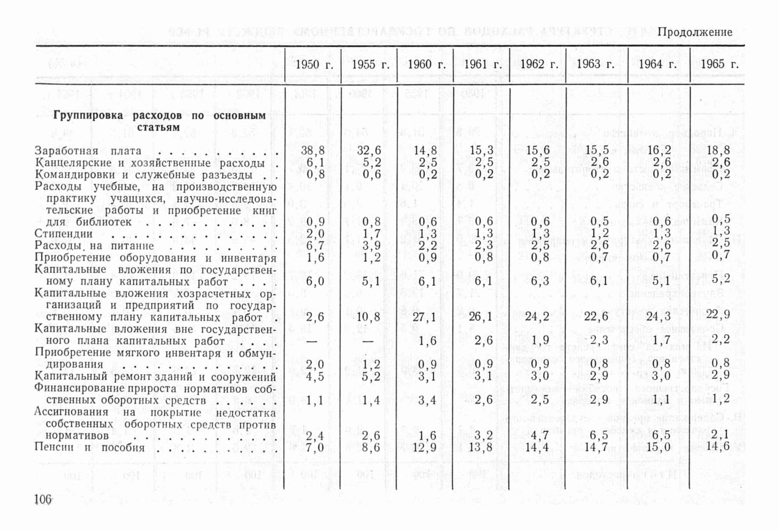 Содержит сгруппированные по основным статьям доли расходов по государственному бюджету РСФСР в периоды 1950, 1955, 1960-1965 в процентах.