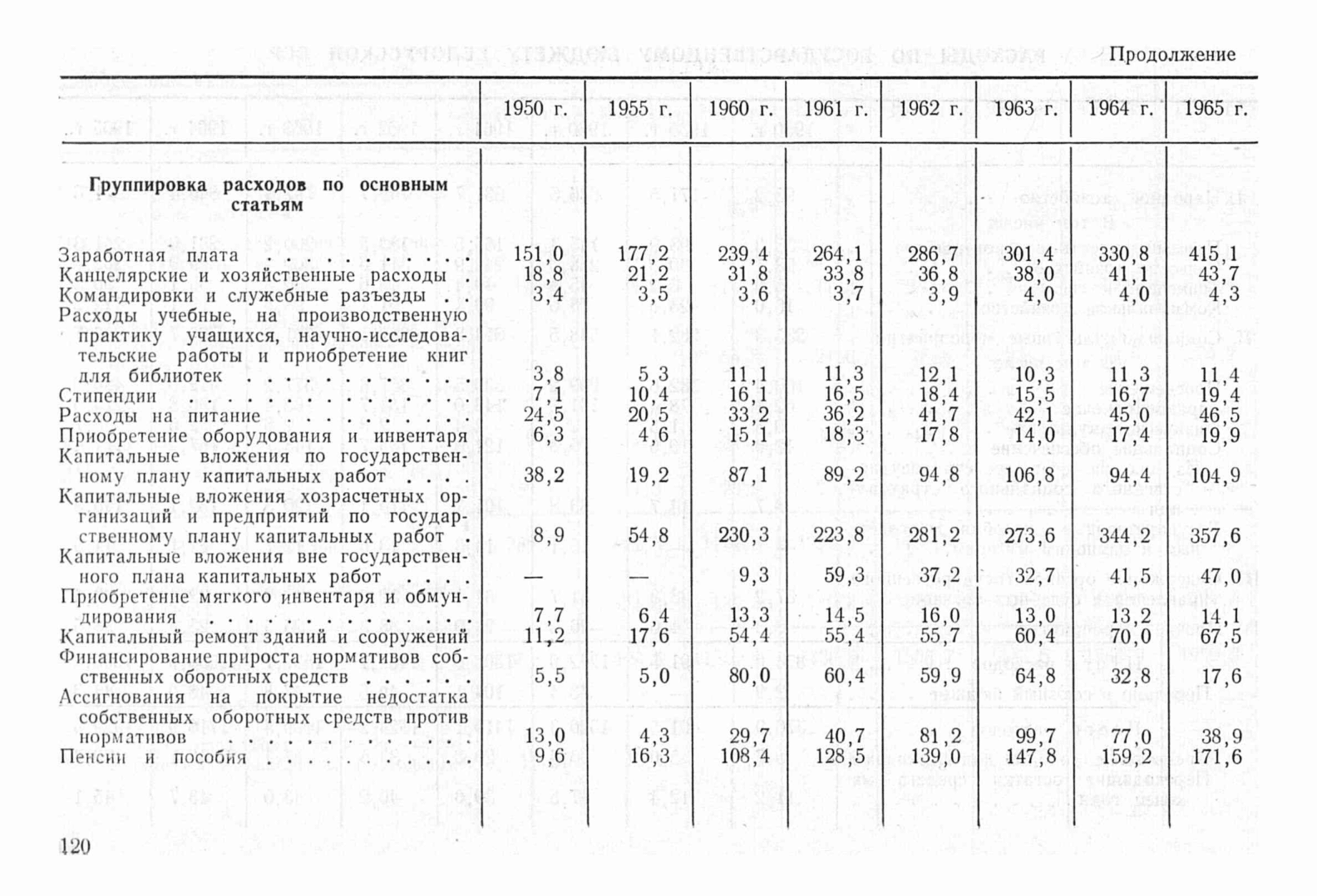 Содержит сгруппированные по основным статьям расходы по государственному бюджету Белорусской ССР в периоды 1950, 1955, 1960-1965 в миллионах рублей.