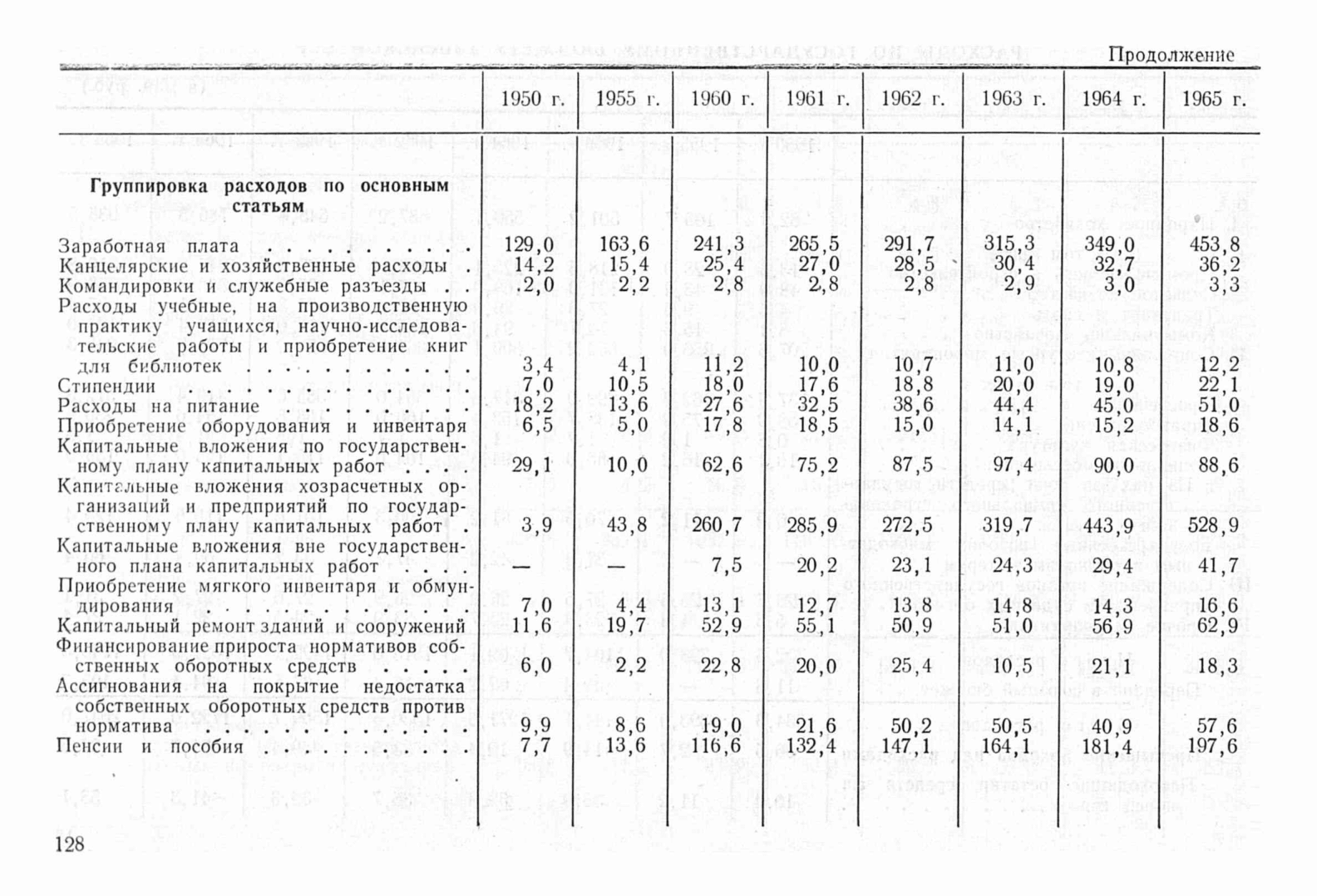 Содержит сгруппированные по основным статьям расходы по государственному бюджету Узбекской ССР в периоды 1950, 1955, 1960-1965 в миллионах рублей.