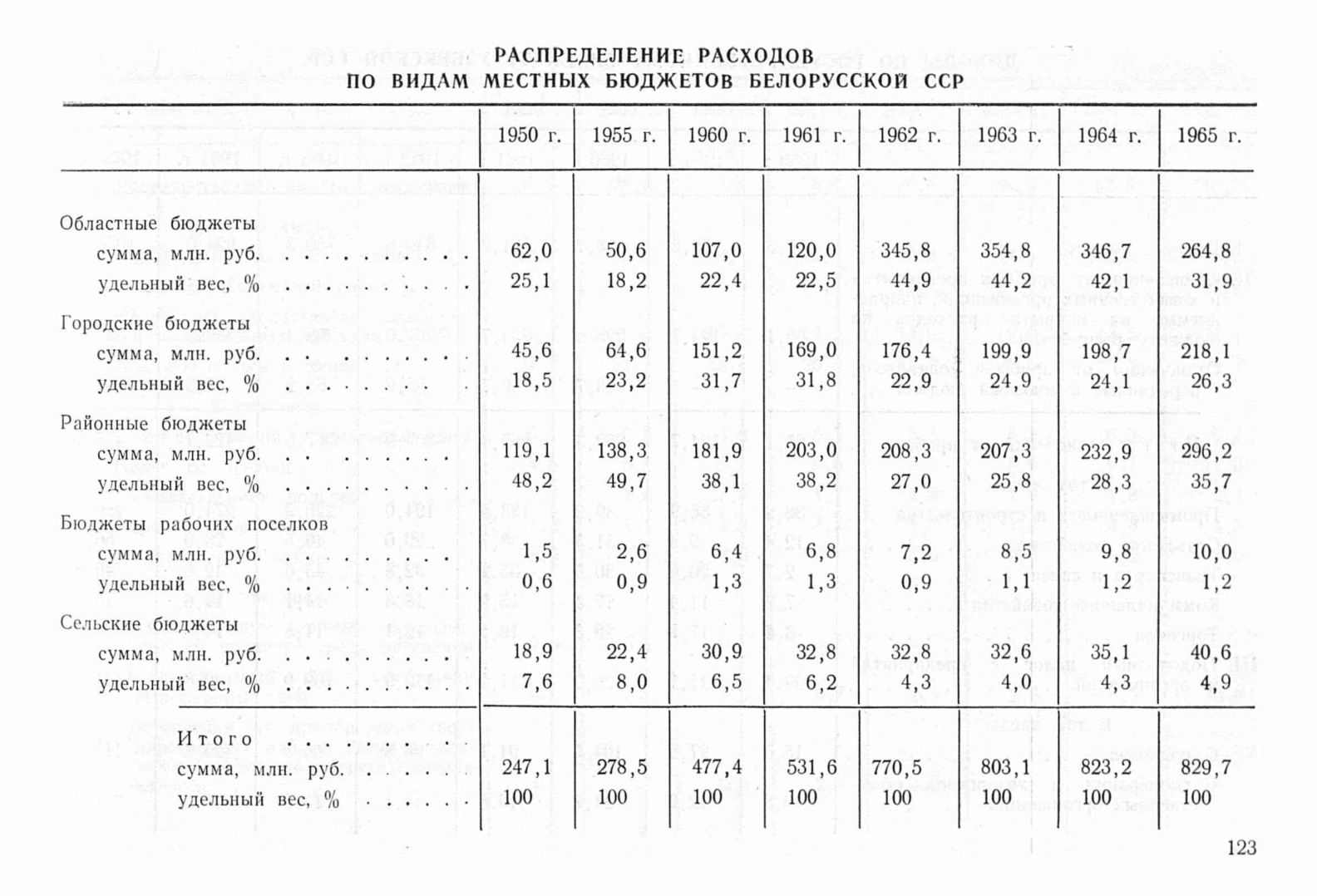 Содержит сведения о распределении расходов по видам местных бюджетов Белорусской ССР в периоды 1950, 1955, 1960-1965 в миллионах рублей и в процентах.
