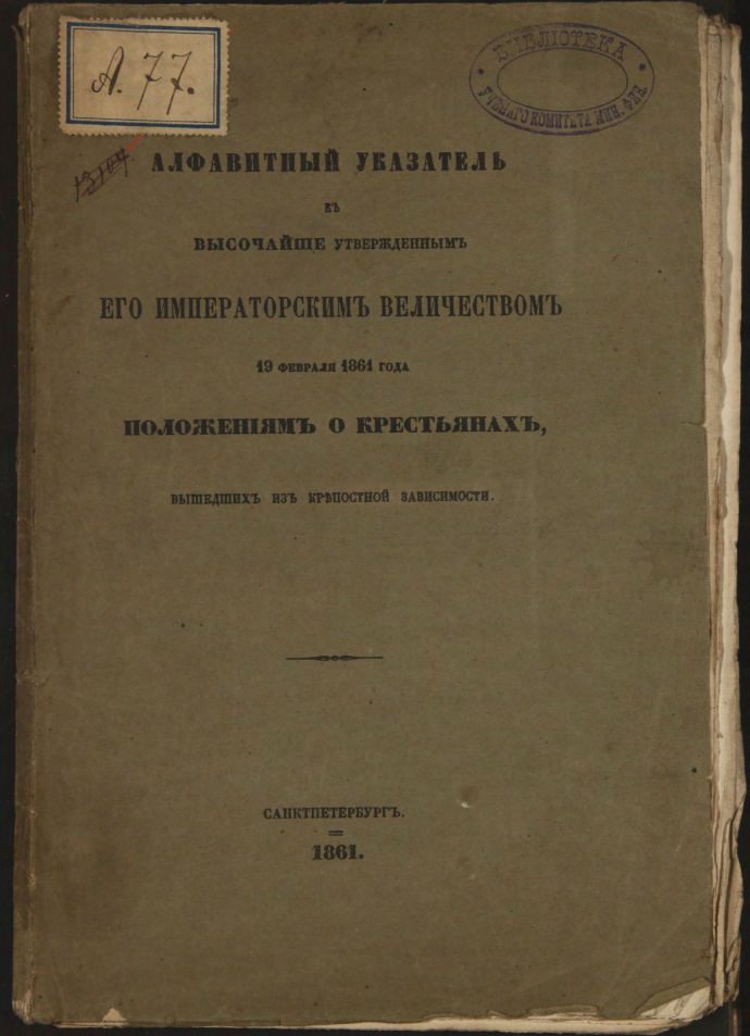 Алфавитный указатель по Высочайше утвержденным Его Императорским Величеством 19 февраля 1861 года Положениям о крестьянах, вышедших из крепостной зависимости.