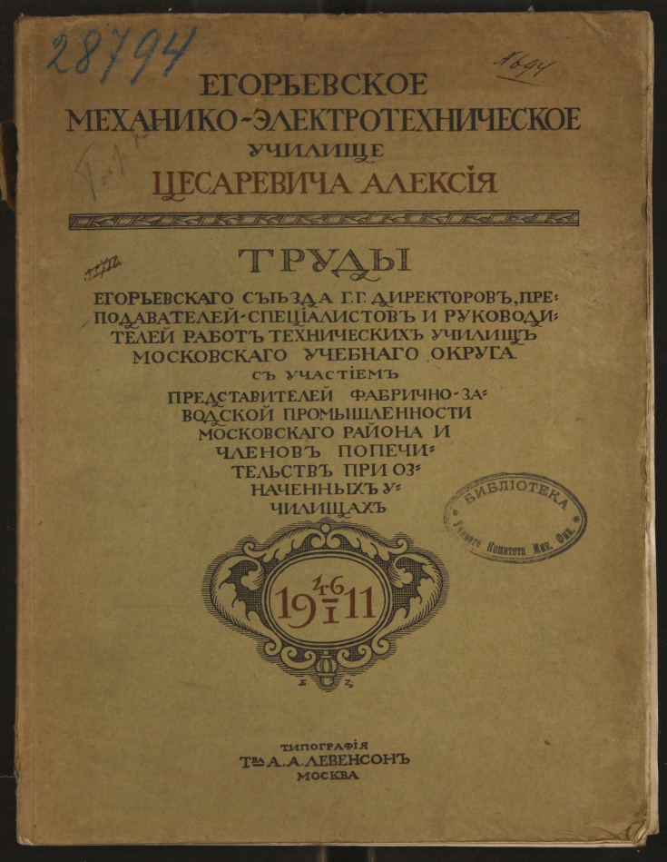 Труды Егорьевского съезда гг.. директоров, преподавателей-специалистов и руководителей работ технических училищ Московского учебного округа с участием представителей фабрично-заводской промышленности Московского района и членов попечительств при означенных училищах