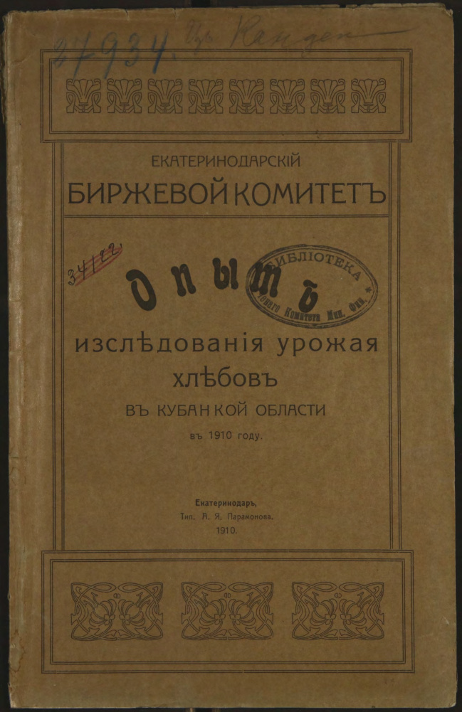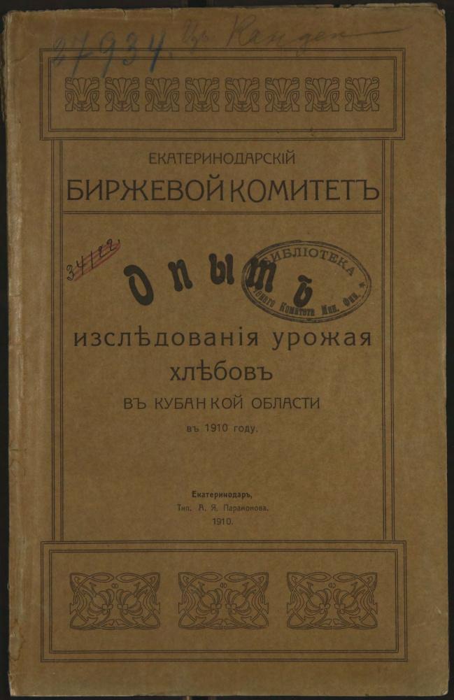 Опыт исследования урожая хлебов в Кубанской области в 1910 году
