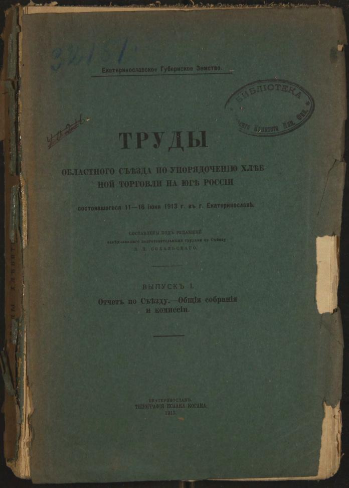 Труды Областного съезда по упорядочению хлебной торговли на юге России, состоявшегося 11-16 июня 1913 г. в г. Екатеринославе. Выпуск 1