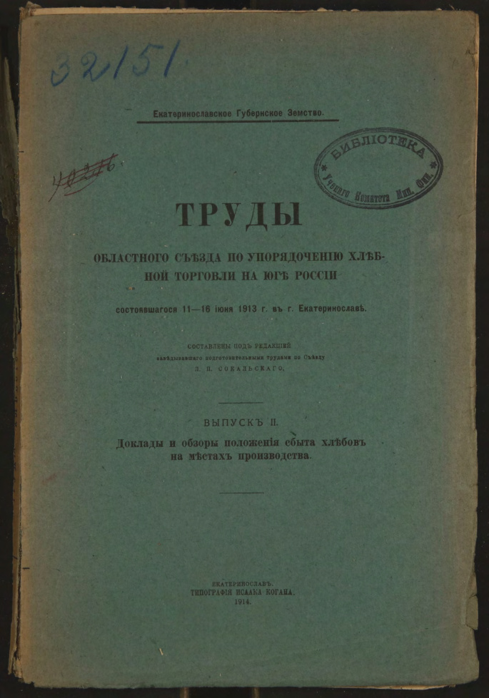 Труды Областного съезда по упорядочению хлебной торговли на юге России, состоявшегося 11-16 июня 1913 г. в г. Екатеринославе. Выпуск 2