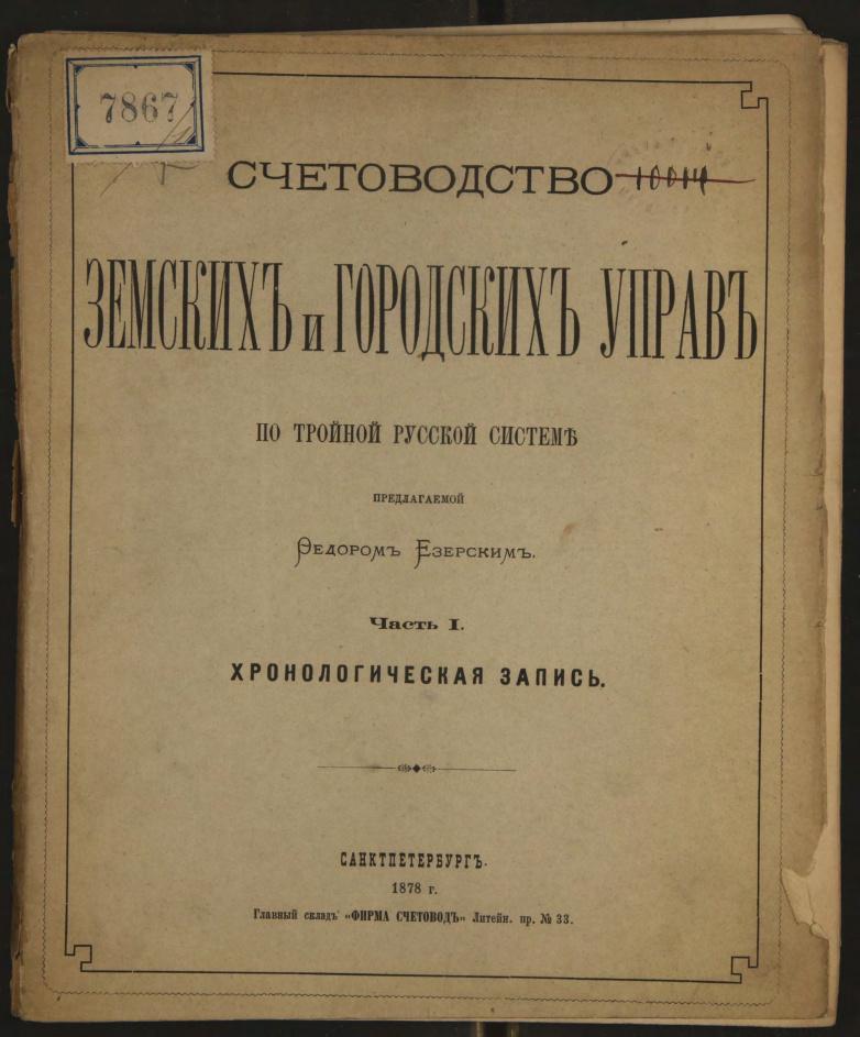 Счетоводство земских и городских управ по тройной русской системе, предлагаемой Федором Езерским. Ч.1.