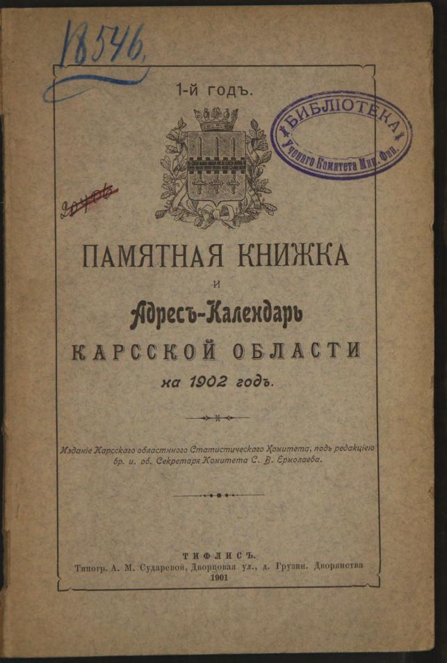 Памятная книжка и адрес-календарь Карсской области на 1902 год.