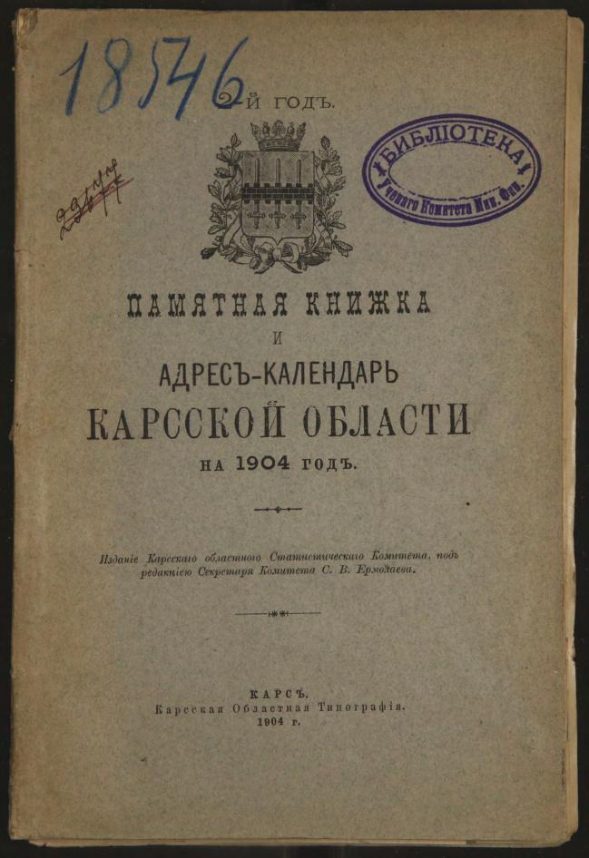 Памятная книжка и адрес-календарь Карсской области на 1904 год.
